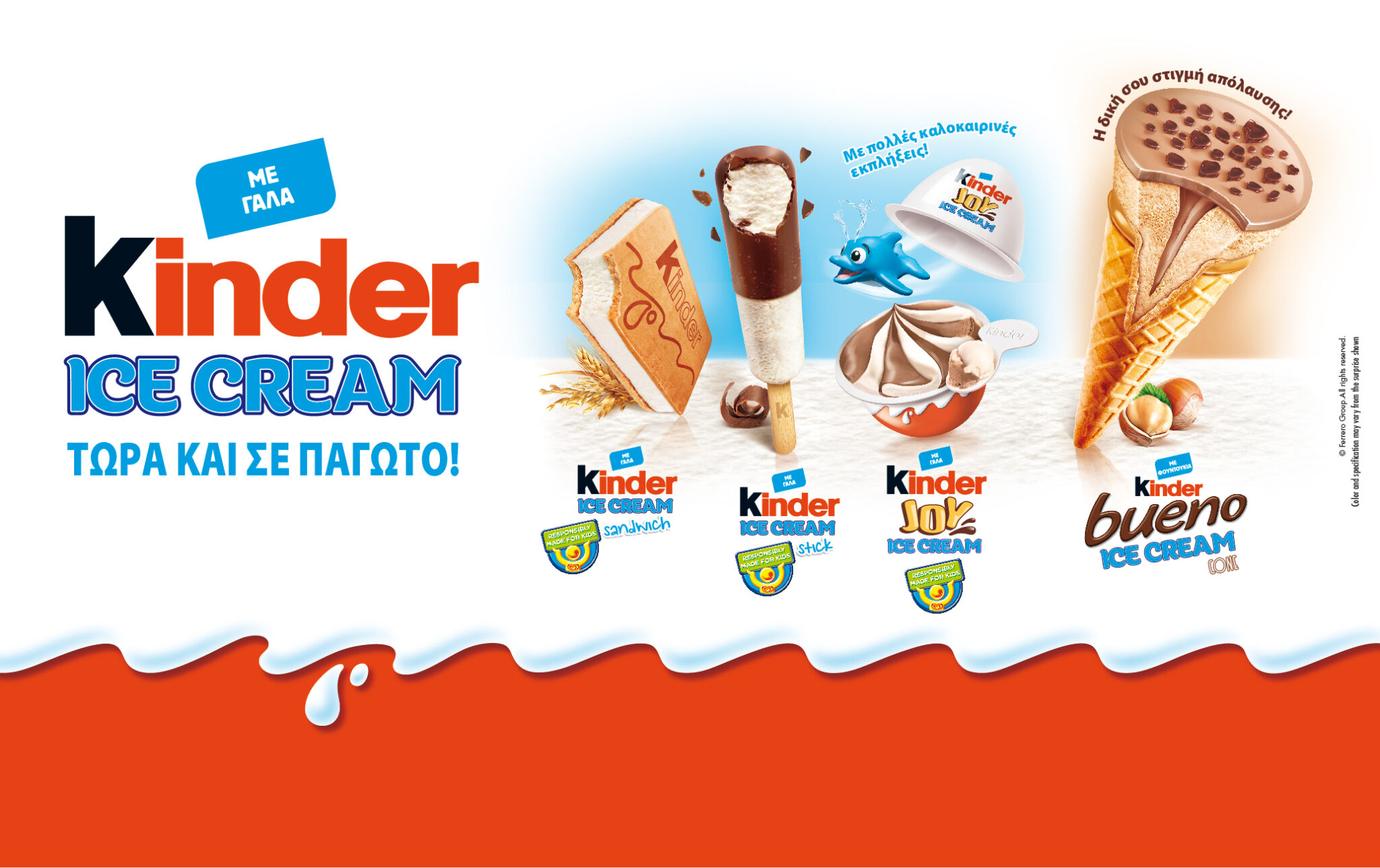 Τα νέα παγωτά περιέχουν χαρακτηριστικά συστατικά που συνθέτουν τη μοναδική εμπειρία KINDER απόλαυσης. Μια πρόταση αφιερωμένη στα παιδιά –με απίθανη γεύση, μικρές μερίδες και συμβατή με τα αυστηρά διατροφικά κριτήρια της Unilever για την παραγωγή παιδικών παγωτών με τη σήμανση “Υπεύθυνα Φτιαγμένο για τα Παιδιά”, καθώς και μια πρόταση Kinder Bueno για το ευρύτερο κοινό.