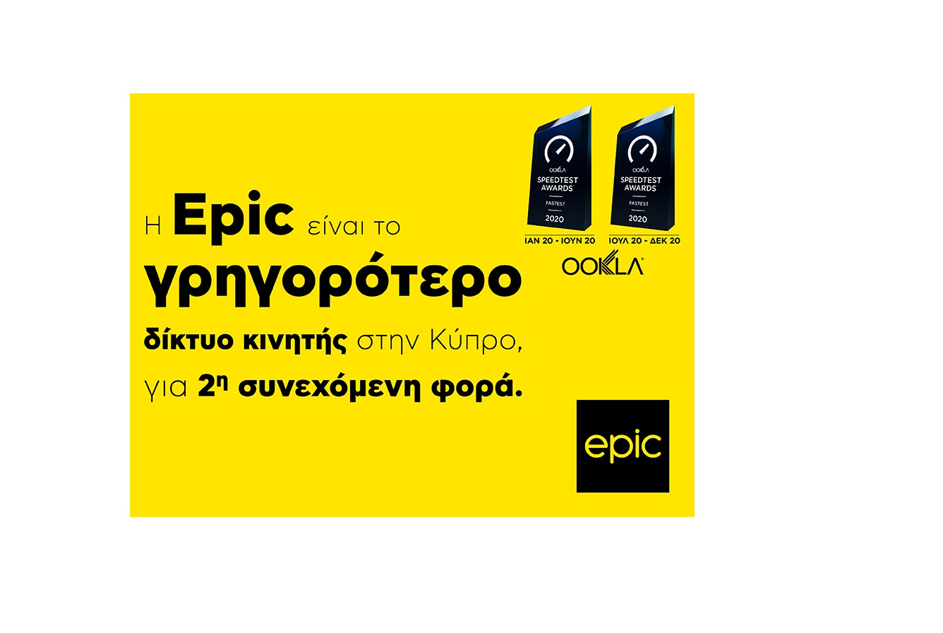 Σύμφωνα με τα νέα αποτελέσματα του Speedtest®, η Ookla ανέδειξε ξανά την Epic ως το «Γρηγορότερο Δίκτυο Κινητής στην Κύπρο» (“Fastest Mobile Network in Cyprus”) για την περίοδο από 1 Ιουλίου έως 31 Δεκεμβρίου 2020, καταγράφοντας άνοδο σε όλες τις κατηγορίες που βαθμολογούνται για να δοθούν τα βραβεία.