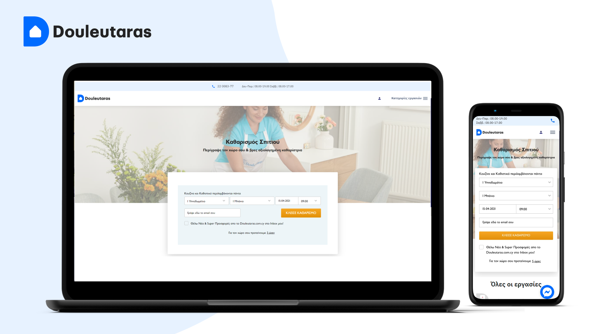 Πλέον των εργασιών επισκευής και βελτίωσης σπιτιού, η πλατφόρμα Douleutaras αλλάζει και τον τρόπο αναζήτησης επαγγελματία καθαρισμού για το Σπίτι αλλά και το Γραφείο. Μέσω της πλατφόρμας του Douleutaras, μπορεί κανείς να βρει με γρήγορο και εύκολο τρόπο, αξιολογημένο επαγγελματία καθαρισμού στην περιοχή, μέσα από ένα επιλεγμένο τοπικό δίκτυο επαγγελματιών σε Λευκωσία, Λάρνακα, Λεμεσό και Πάφο. Η συγκεκριμένη υπηρεσία του Douleutaras έχει ήδη πραγματοποιήσει πάνω από 58.000 καθαρισμούς σε Ελλάδα και Κύπρο, με μέσο όρο αξιολογήσεων 4,7/5.