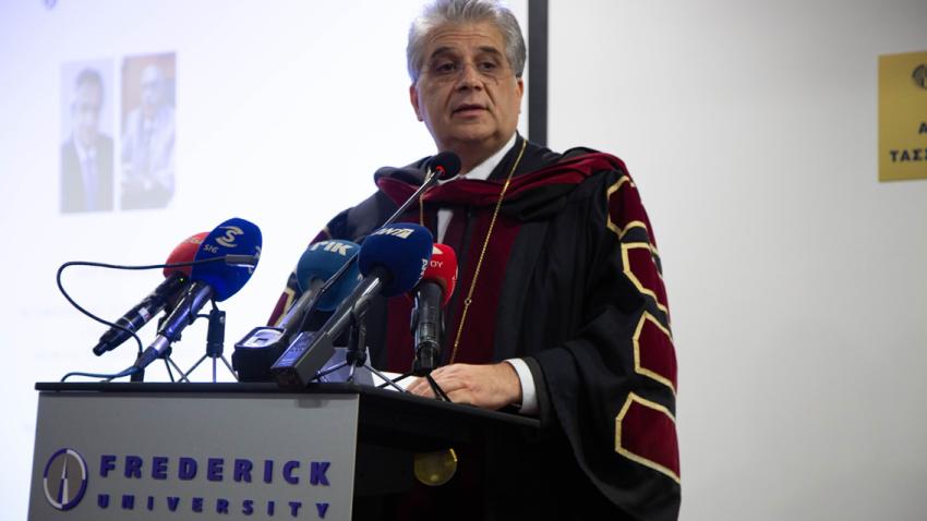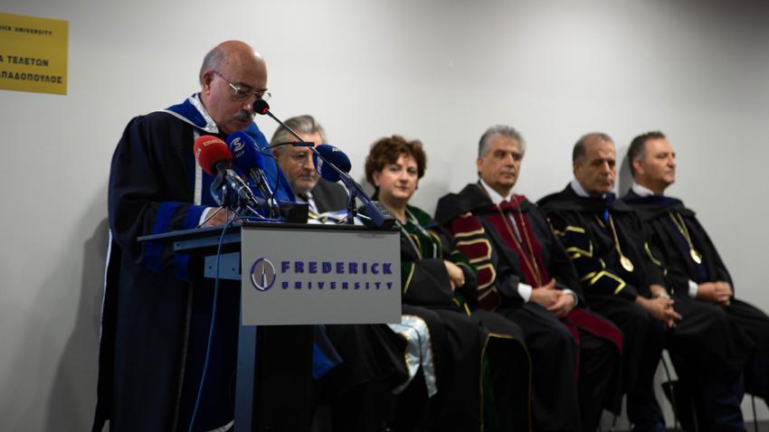 Στον χαιρετισμό του ο Πρύτανης του Πανεπιστημίου Frederick Καθηγητής Γιώργος Δημοσθένους, ανέφερε ότι το Πανεπιστήμιο τιμά αυτές τις δύο εξέχουσες προσωπικότητες για τη μεγάλη τους προσφορά στη νομική επιστήμη, αλλά και για τις καίριες παρεμβάσεις τους με σκοπό την απρόσκοπτη και ανεξάρτητη λειτουργία της Δικαιοσύνης, σε Κύπρο και Ελλάδα. Συνεχίζοντας, αναφέρθηκε στο Τμήμα Νομικής του Πανεπιστημίου Frederick, το οποίο έχει να επιδείξει ιδιαίτερα αξιόλογη δραστηριότητα, πολυσήμαντο και πολυδιάστατο έργο, αλλά και σημαντικότατες επιτυχίες, τόσο του ακαδημαϊκού του προσωπικού όσο και των φοιτητών του.
