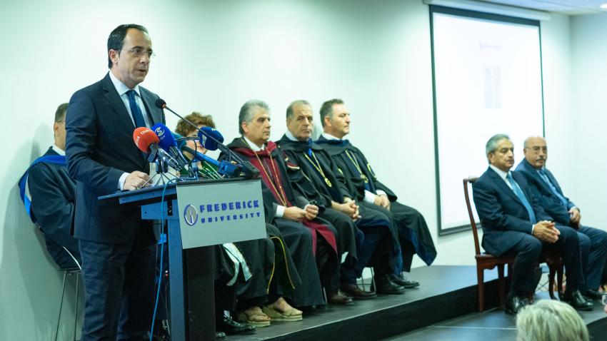 Στον χαιρετισμό του ο Υπουργός Εξωτερικών Δρ Νίκος Χριστοδουλίδης, αφού συνεχάρη το Πανεπιστήμιο Frederick για τη διοργάνωση της Τελετής Αναγόρευσης, αλλά και για την πολυετή και αυθεντική προσφορά του στα ακαδημαϊκά δρώμενα του τόπου, αναφέρθηκε στο πολυσήμαντο έργο των τιμωμένων προς την κοινωνία και την πολιτεία. Ιδιαίτερη αναφορά έκανε στον Γενικό Εισαγγελέα της Κυπριακής Δημοκρατίας και στις προσωπικές του προσπάθειες για στήριξη του έργου του Υπουργείου Εξωτερικών, καθώς και για τον επαγγελματισμό και την ποιότητα της εργασίας που παράγεται στη Νομική Υπηρεσία. Κλείνοντας δήλωσε ότι «Η σημερινή διάκριση αποτελεί την απαρχή δημιουργίας μιας αμφίδρομης και αμοιβαία επωφελούς σχέσης μεταξύ του Πανεπιστημίου Frederick και των τιμώμενων προσώπων, αφού η ακαδημαϊκή τους συνεισφορά σε συνδυασμό με την τεχνοκρατική τους εμπειρογνωμοσύνη, προσθέτει αξία και ενισχύει το κύρος του Τμήματος Νομικής του Πανεπιστημίου».
