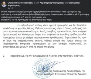 «Η επιβραδυντική σκόνη, είναι αρκετά αραιωμένη και δε θεωρείται επικίνδυνη σε χαμηλές δόσεις. Πιθανές επιπτώσεις, είναι ο ήπιος ερεθισμός στα μάτια ή το αναπνευστικό σύστημα. Αυτές συνήθως προκαλούνται, όταν υπάρχει άμεση επαφή και ιδιαίτερα με άτομα που ανήκουν σε ευπαθείς ομάδες (παιδιά, ηλικιωμένοι, άτομα με άσθμα, αναπνευστικά προβλήματα). Σημειώνεται ότι, πριν τη ρίψη της επιβραδυντικής σκόνης, δόθηκε οδηγία στο Τμήμα Δασών και Πυροσβεστική Υπηρεσία, προκειμένου να μην υπάρχει προσωπικό, σε αποστάσεις 250 μέτρων, από το σημείο της ρίψης.»