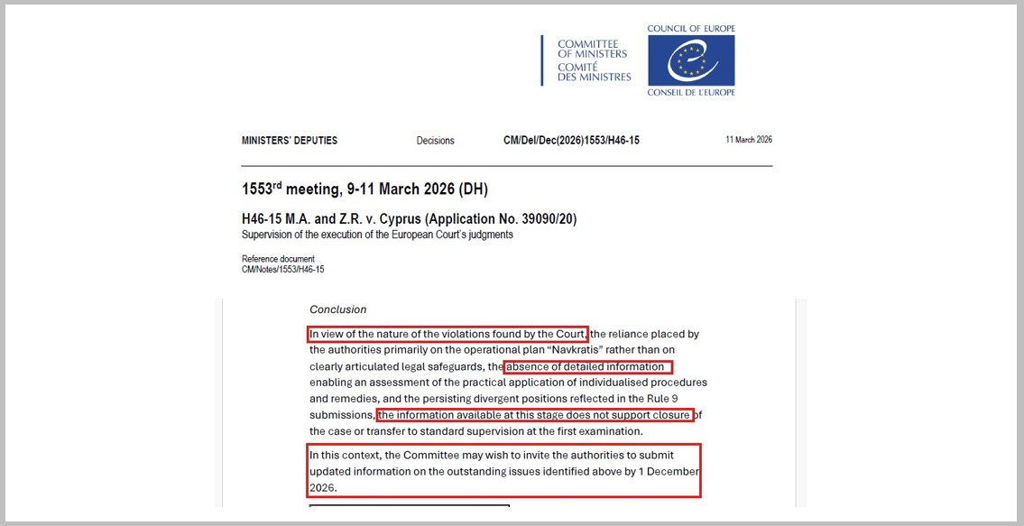 Καταληκτικά, η Επιτροπή Υπουργών του Συμβουλίου της Ευρώπης έκρινε ότι λαμβανομένων υπόψη: της σοβαρότητας των παραβιάσεων, την εξάρτηση κυρίως από το επιχειρησιακό σχέδιο «Ναυκράτης», την έλλειψη σαφών νομικών εγγυήσεων και τις αντικρουόμενες πληροφορίες από ΜΚΟ και αρχές, η διαθέσιμη πληροφόρηση δεν επιτρέπει το κλείσιμο της υπόθεσης ή τη μεταφορά της σε απλή εποπτεία, καλώντας τις κυπριακές αρχές έως την 1η Δεκεμβρίου 2026, να υποβάλουν επικαιροποιημένες πληροφορίες.