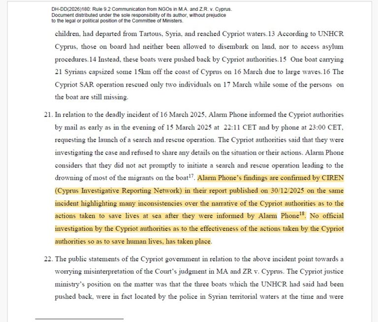 Στην έκθεση των ΜΚΟ έγινε επίσης αναφορά στο τραγικό περιστατικό του ναυαγίου με μετανάστες που σημειώθηκε τον Μάρτιο του 2025 ανοικτά του Κάβο Γκρέκο με 7 νεκρούς και 12 αγνοούμενους και συγκεκριμένα στα ευρήματα δημοσιογραφικής έρευνας του δικτύου CiREN που κατέδειξαν ασυνέπεια σε σχέση με τα όσα υποστήριξαν οι κυπριακές αρχές περί άμεσης ανταπόκρισης στο περιστατικό και τα δεδομένα που συλλέχθηκαν από ανοικτές πηγές και δορυφόρους.