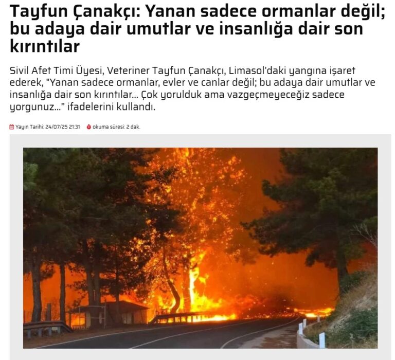 Η εφημερίδα «Αβρούπα» (Ευρώπη), με τίτλο «Καίγεται η Κύπρος» αναφέρεται στις πυρκαγιές στην επαρχία Λεμεσού και γράφει ότι η Κύπρος ζει μια από τις μεγαλύτερες καταστροφές μετά το 1974, με δύο νεκρούς και μεγάλες αποστάσεις δασικών περιοχών που μετατράπηκαν σε στάχτη. Η εφημερίδα γράφει ακόμα ότι η ε/κ πλευρά ουσιαστικά δεν απέρριψε την πρόταση της τ/κ πλευράς για συνδρομή στην κατάσβεση της πυρκαγιάς αφού αυτή έπρεπε να γίνει από αέρος και όχι από το έδαφος. Αναφέρει ακόμα ότι την περιοχή της καταστροφής επισκέφτηκε και ο ηγέτης του Ρεπουμπλικανικού Τουρκικού Κόμματος, Τουφάν Ερχιουρμάν.