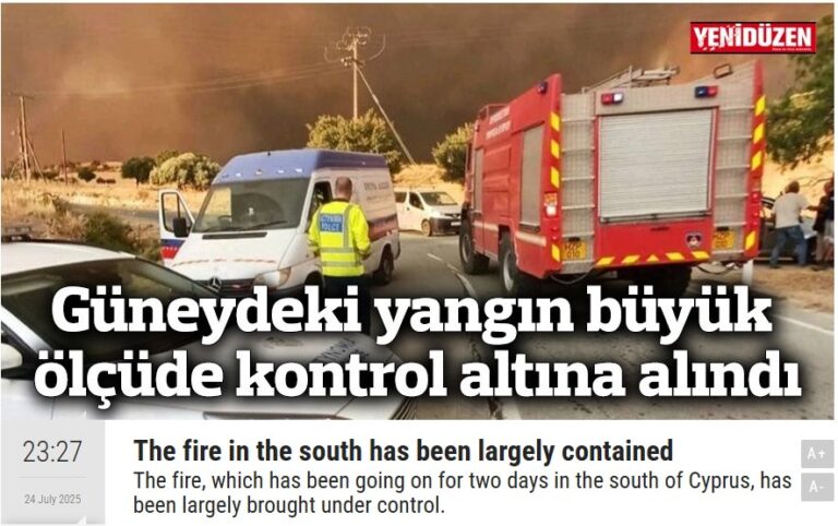 Η εφημερίδα «Γενί Ντουζέν» (Νέα τάξη), με τίτλο «Πενθεί η Κύπρος», γράφει ότι πέραν των 40 ωρών δίνεται μάχη με τις φλόγες στην επαρχία Λεμεσού, σε μια πυρκαγιά που κατέστρεψε πέραν των 100 τετραγωνικών χιλιομέτρων με άγρια βλάστηση και δέντρα ενώ άφησε πίσω της δύο νεκρούς. Προβάλλει ακόμα δηλώσεις του Υπουργού Δικαιοσύνης και Δημόσιας Τάξης, Μάριου Χαρτσιώτη, σχετικά με το εύρος της καταστροφής και γράφει ότι την περιοχή επισκέφτηκε και ο ηγέτης του ΡΤΚ Τουφάν Ερχιουρμάν, ενώ δημοσιεύει και φωτογραφίες από τις πυρκαγιές.