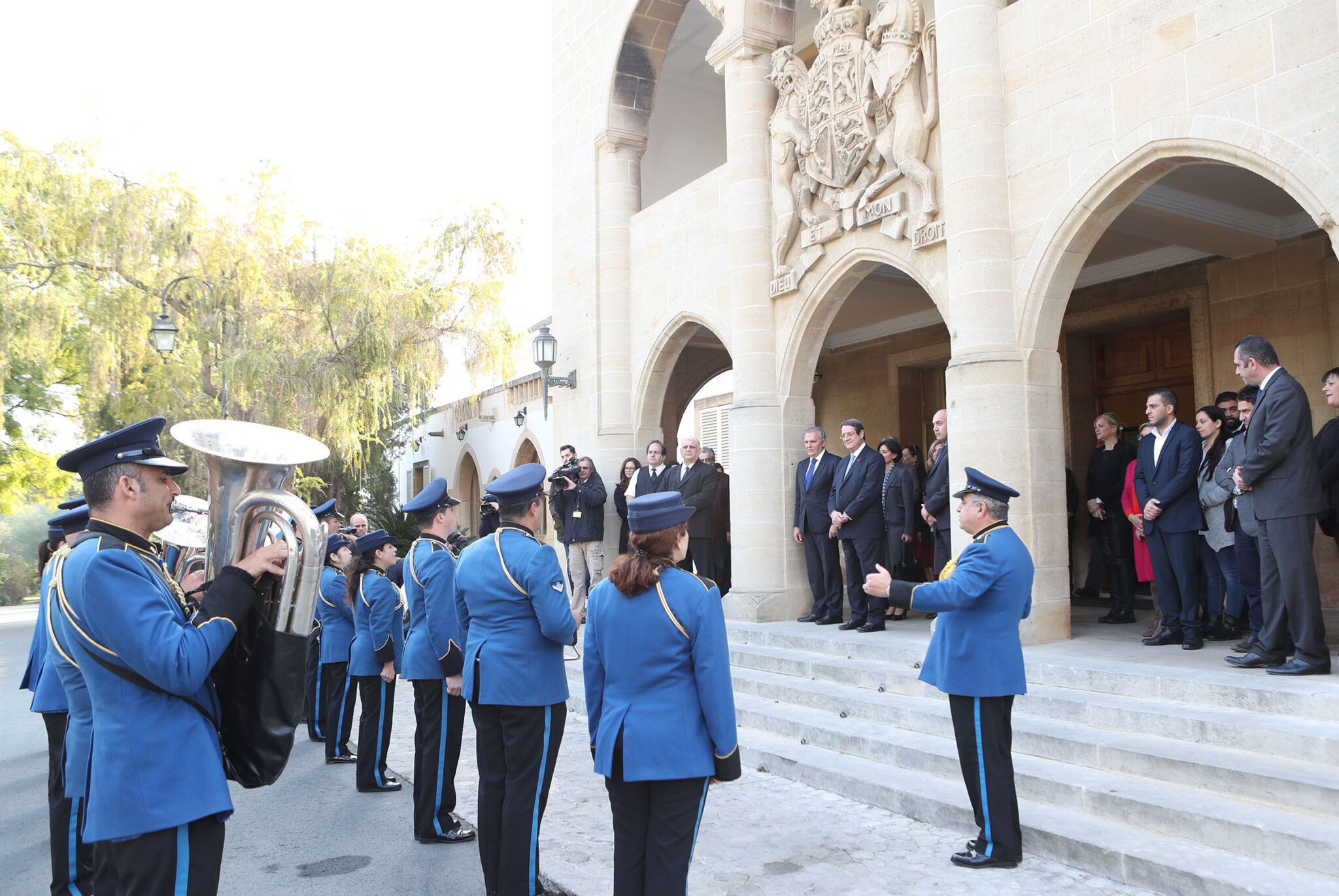 Τα Κάλαντα από τις φιλαρμονικές της Στρατιωτικής Μουσικής της Εθνικής Φρουράς και της Ελληνικής Δύναμης Κύπρου άκουσε στο Υπουργείο Αμυνας, ο Χριστόφορος Φωκαίδης.