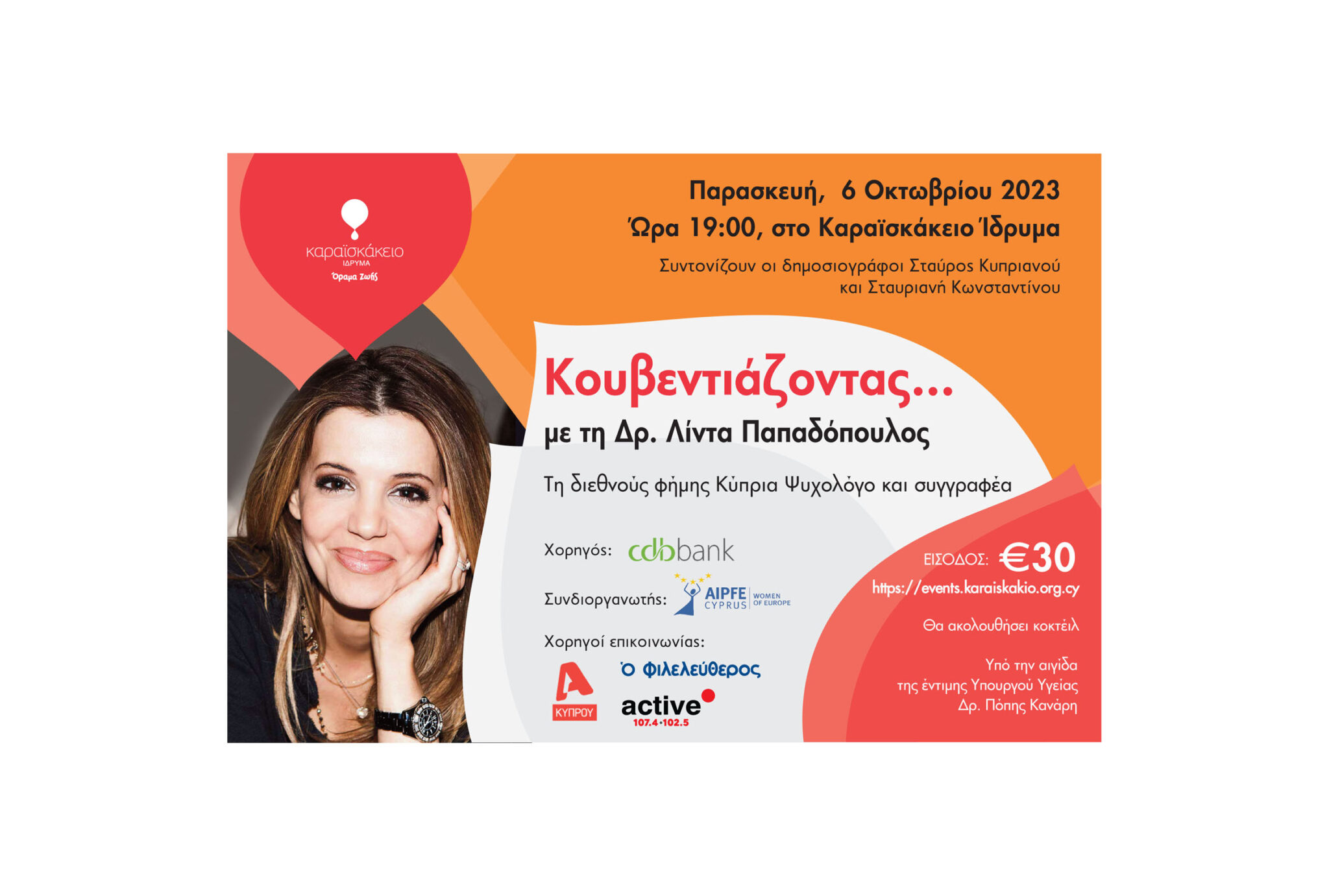 Την Παρασκευή 6 Οκτωβρίου 2023 στις 19:00, το Καραϊσκάκειο Ίδρυμα διοργανώνει τη Φιλανθρωπική εκδήλωση «Κουβεντιάζοντας με τη Δρ. Λίντα Παπαδόπουλος», υπό την αιγίδα της έντιμης Υπουργού Υγείας Δρ. Πόπης Κανάρη. Η εκδήλωση θα διεξαχθεί στις εγκαταστάσεις του Καραϊσκάκειου Ιδρύματος. Θα είναι μια διαδραστική συζήτηση με την Δρ. Λίντα Παπαδόπουλος, με συντονιστές τον Δημοσιογράφο Σταύρο Κυπριανού και Σταυριανή Κωνσταντίνου, για διάφορα καυτά ζητήματα της σύγχρονης εποχής που αφορούν όλους μας.