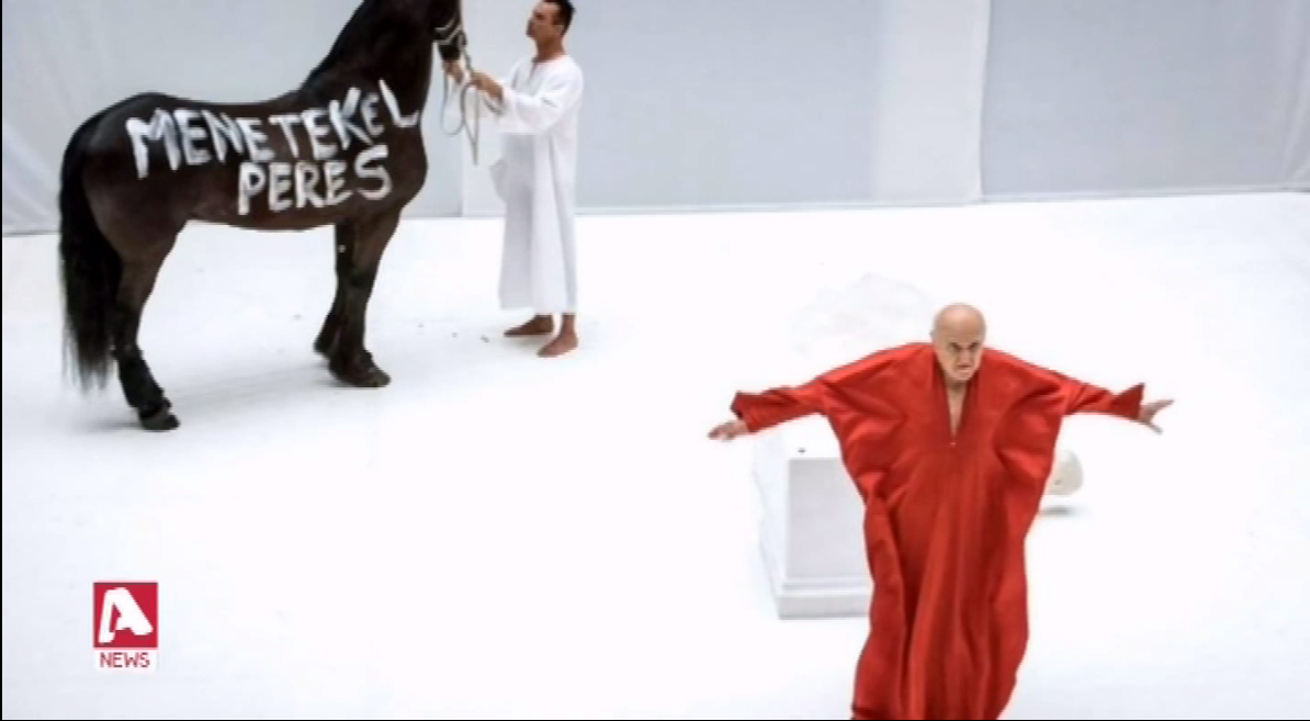Άσπρα γράμματα σχηματίζουν πάνω στο άλογο, τη λέξη “μονοπώλιο” από τη βίβλο στα αραμαϊκά με λατινικούς χαρακτήρες. Πολίτης έκανε καταγγελία στο Κόμμα για τα Ζώα. Ανέφερε ότι το άλογο ήταν αναστατωμένο και έκανε προσπάθεια να ξεφύγει από τα χέρια του δαμαστή του και του δεύτερου ηθοποιού, ενώ έβαφαν το σώμα του.