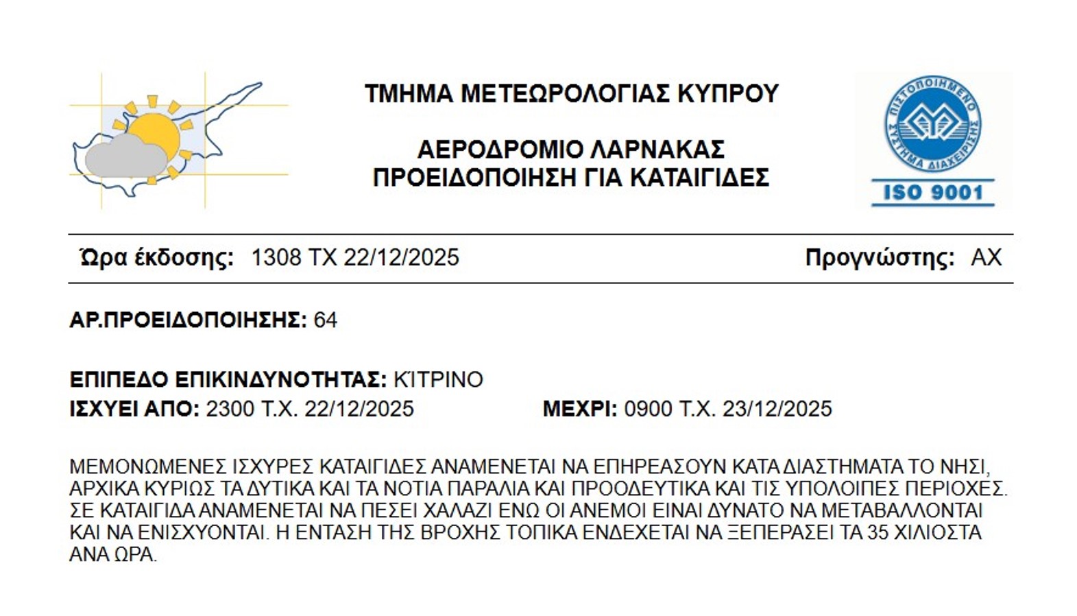 Κίτρινη προειδοποίηση εξέδωσε η Μετεωρολογική Υπηρεσία για έντονα καιρικά φαινόμενα τα οποία αρχίζουν από το βράδυ της Δευτέρας μέχρι το πρωί της Τρίτης.