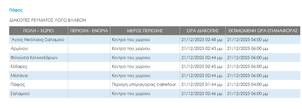 Την ίδια ώρα εν μέσω έντονων καιρικών φαινομένων χωρίς ρεύμα λόγω βλάβης στο δίκτυο της ΑΗΚ έχουν μείνει αρκετές περιοχές της επαρχίας Πάφου.