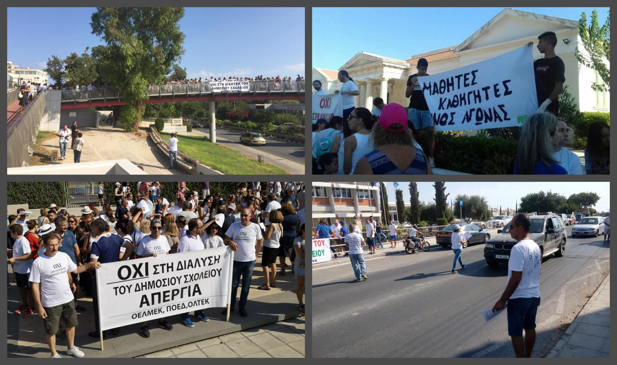 Mε πανό, πλακάτ και ενημερωτικά έντυπα προς τους πολίτες, βγήκαν σήμερα στους δρόμους δάσκαλοι και καθηγητές έξω από δημόσια σχολεία σε όλες τις πόλεις της ελεύθερης Κύπρου.