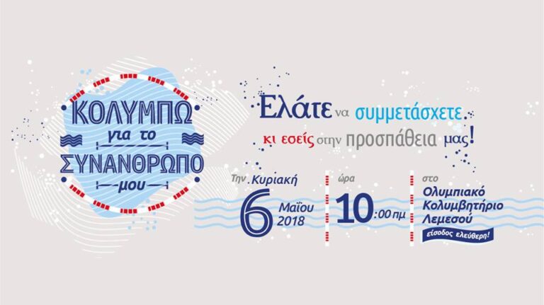 Το Κολυμβητήριο Ιακώβου και ο Αντιρευματικός Σύνδεσμος Κύπρου στηρίζουν και φέτος τους ρευματοπαθείς συνανθρώπους μας διοργανώνοντας την Κυριακή 6 Μαΐου 2018, στις 10πμ, στο Ολυμπιακό Κολυμβητήριο Λεμεσού την ετήσια Φιλανθρωπική κολυμβητική εκδήλωση «Κολυμπώ για το Συνάνθρωπο μου 2018». Η εκδήλωση είναι αφιερωμένη όπως κάθε χρόνο στη μνήμη του Πανίκου Ιακώβου, o οποίος άφησε ανεξίτηλη τη σφραγίδα του στα αθλητικά δρώμενα της Κύπρου.