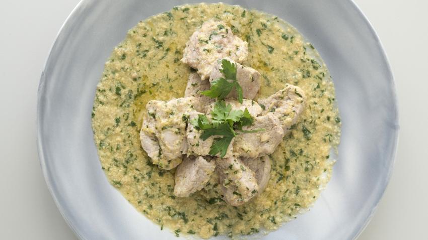 Σοφρίτο με χοιρινό φιλέτο «του Χασάπη» και λευκό κρασί Cimarosa, Σκορδάκι και Ξύσμα λεμόνι.