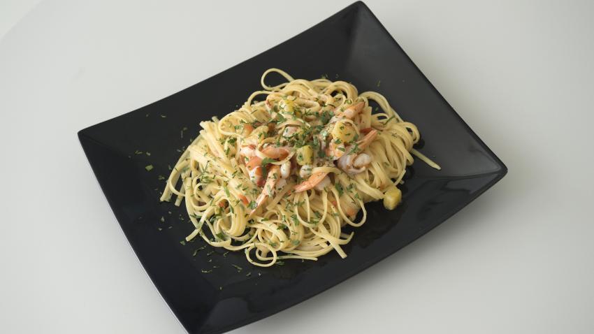 Λιγκουίνι με γαρίδες, Σκορδάκι ψιλοκομμένο, Μαϊντανό, ανανά κομμένο σε μικρά καρέ, φρέσκο Τζίντζερ τριμμένο στον τρίφτη και Μηλόξυδο Deluxe, και