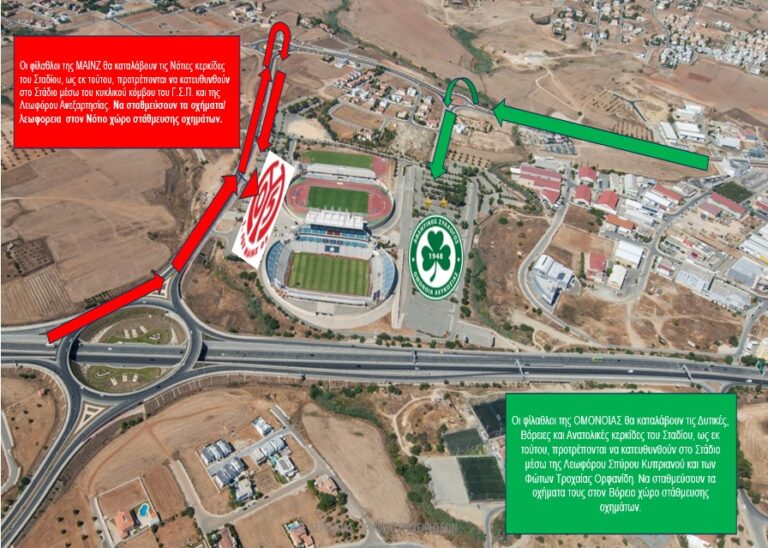 Οι φίλαθλοι της ΟΜΟΝΟΙΑΣ, θα καταλάβουν τις δυτικές, βόρειες και ανατολικές κερκίδες του σταδίου, ως εκ τούτου, προτρέπονται να κατευθυνθούν στο στάδιο μέσω της λεωφόρου Σπύρου Κυπριανού και των φώτων τροχαίας Ορφανίδη. Να σταθμεύσουν τα οχήματα τους στον δυτικό και στον βόρειο χώρο στάθμευσης οχημάτων.