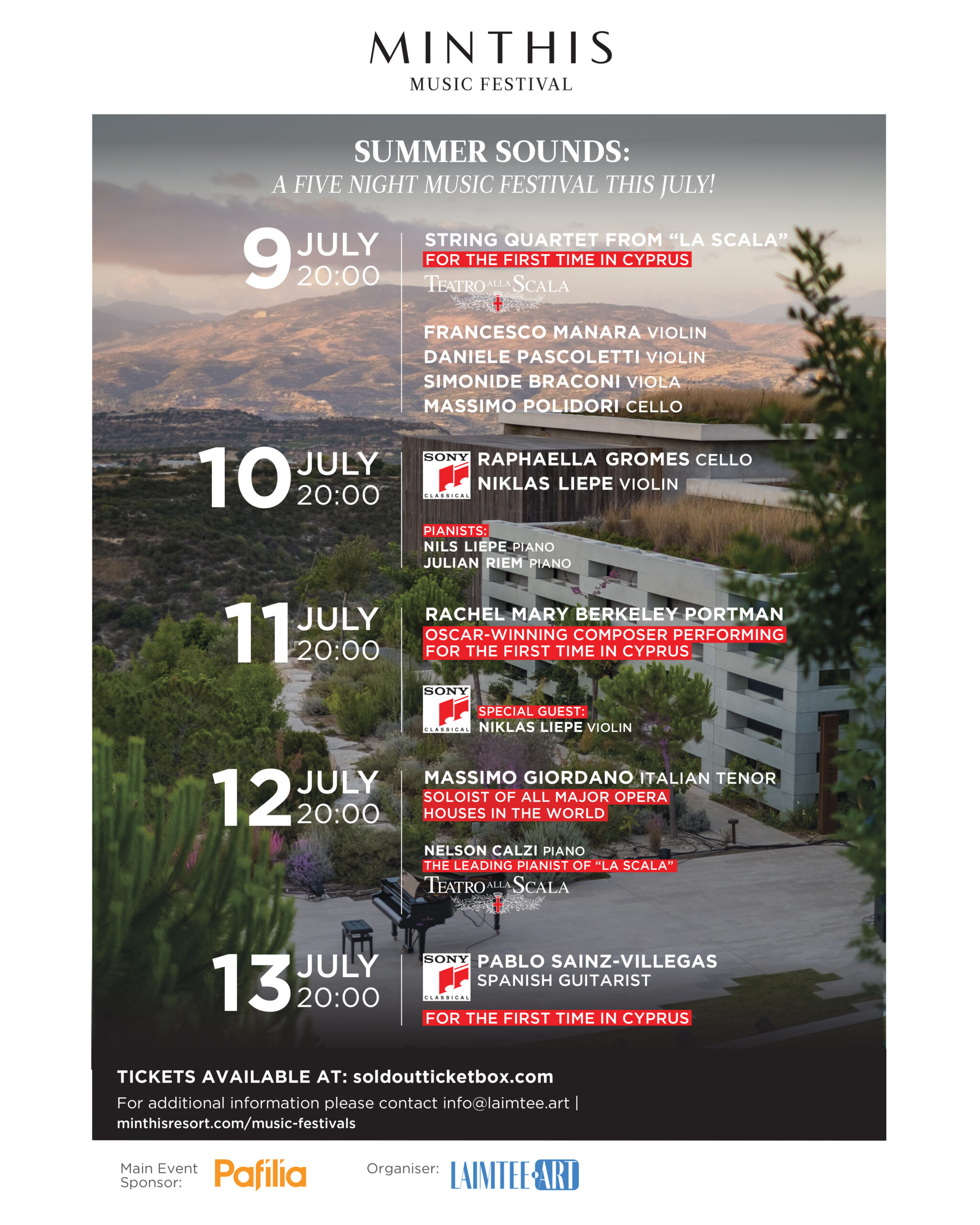 Με στόχο να προβάλλει τη χώρα διεθνώς και να αναδείξει την πολιτιστική της ταυτότητα, το Minthis Music Festival 2025 υπόσχεται να γίνει ο αγαπημένος προορισμός για όσους αγαπούν τη μουσική, την τέχνη και την κομψότητα. Ένα γεγονός που θα μείνει αξέχαστο σε όλους όσους το παρακολουθήσουν.