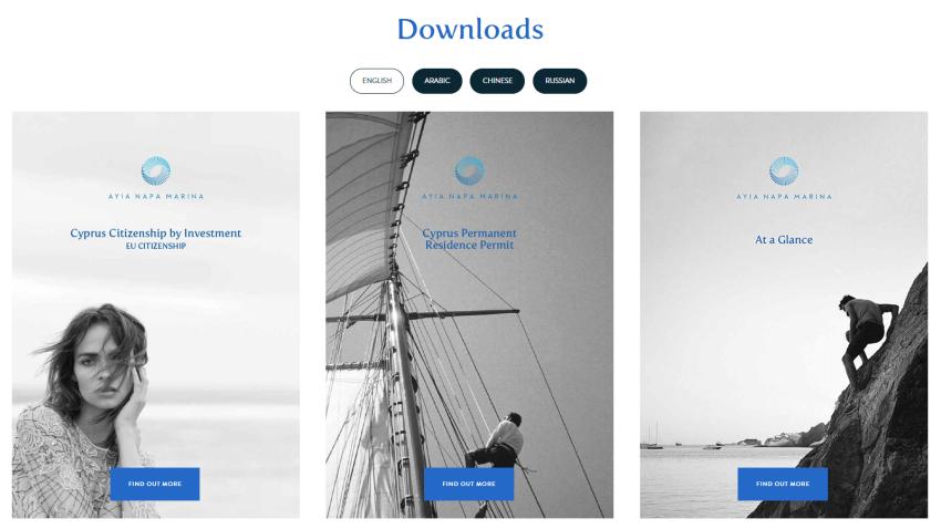 Ανταποκρινόμενη στο διεθνές ενδιαφέρον που παρατηρείται, η ιστοσελίδα παρέχει όλο το ενημερωτικό υλικό, τα εξειδικευμένα φυλλάδια της και τα νέα της εταιρείας στα αγγλικά, τα αραβικά, τα ρωσικά και τα κινέζικα. Οι επισκέπτες της νέας ιστοσελίδας μπορούν να βρουν αποκλειστικές πληροφορίες για τη Μαρίνα και για το σύνολο του έργου, καθώς και να γνωρίσουν τα ιδιαίτερα χαρακτηριστικά των διαμερισμάτων και των ανεξαρτήτων κατοικιών.