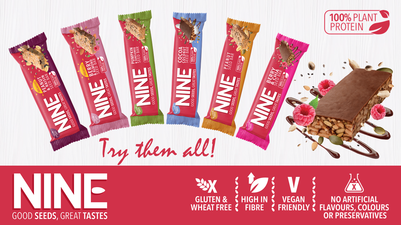 Οι νέες μπάρες ΝΙΝΕ προσφέρονται σε 6 μοναδικές γεύσεις, NINE Seed Bar Cocoa & Coconut με κακάο και καρύδα, NINE Seed Bar Peanut με φιστίκια, NINE Seed Bar Pumpkin & Sunflower με κολοκυθόσπορους και ηλιόσπορους και NINE Seed Bar Berry & Chia με μούρα και σπόρους chia. Η σειρά ολοκληρώνεται με τα ΝΙΝΕ Breakfast Seed Bars ιδανικά για πρόγευμα γιατί περιέχουν βρώμη χωρίς γλουτένη. Προσφέρονται σε 2 γεύσεις, ΝΙΝΕ Breakfast Seed Bar Peanut & Raisin με φιστίκια και σταφίδες και ΝΙΝΕ Breakfast Seed Bar Berry & Almond με μούρα και αμύγδαλα. Δοκιμάστε τα όλα!