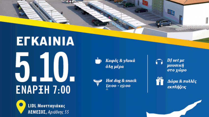 Μη χάσετε την ημέρα έναρξης του νέου καταστήματος Lidl στις 5 Οκτωβρίου 2017 στη Μουτταγιακά, στη Λεμεσό και ελάτε να γιορτάσουμε μαζί το άνοιγμα του 17ου Lidl στην Κύπρο!