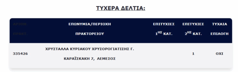Την ίδια ώρα ένας τυχερός βρέθηκε στην 2η κατηγορία, που κερδίζει το ποσό των €100.000, με το τυχερό δελτίο να έχει παιχτεί στην Κύπρο.
