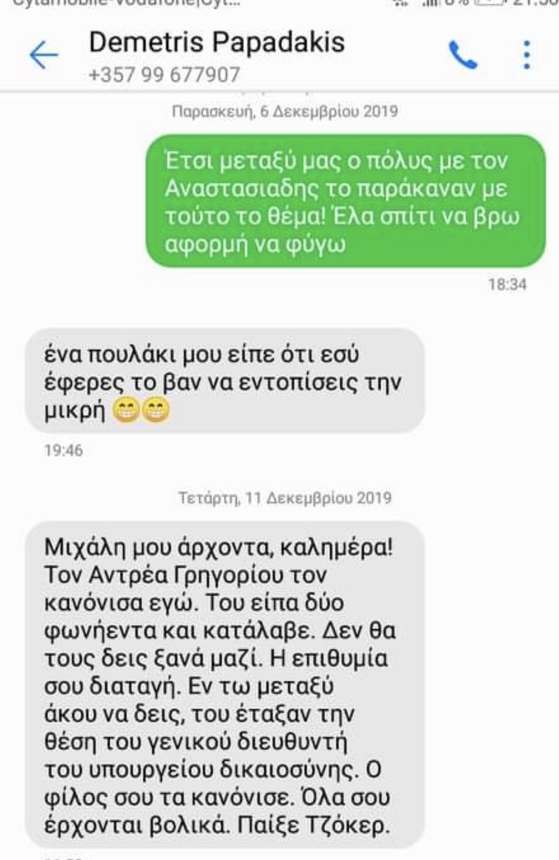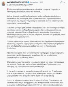 Με ανάρτηση στην πλατφόρμα Χ, ο κύριος Δρουσιώτης φέρνει στο «φως» νέο μήνυμα το οποίο ισχυρίζεται ότι απέστειλε ο ευρωβουλευτής Δημήτρης Παπαδάκης στον δικαστή Μιχάλη Χριστοδούλου και χρονολογείται τον Δεκέμβριο του 2019, στο οποίο ενημέρωνε για διορισμό του Αντρέα Γρηγορίου σε θέση Γενικού Διευθυντή. Τότε, ο κύριος εμφανίζεται ως προϊστάμενος στη «Σάντυ» στο Τμήμα Ταχυδρομικών Υπηρεσιών.