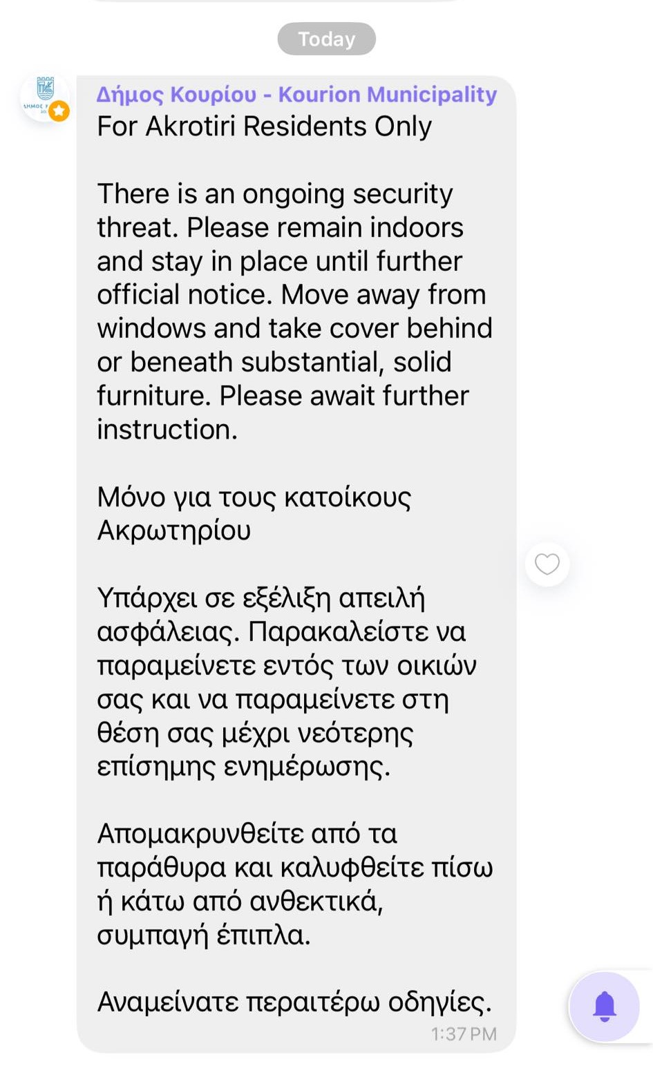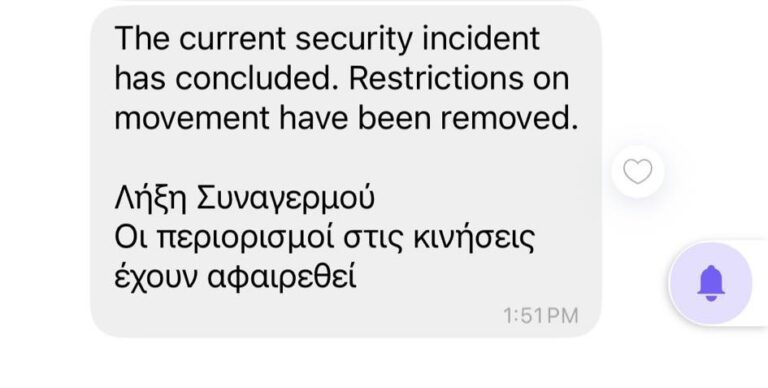 Ο συναγερμός έληξε δεκατέσσερα λεπτά αργότερα, με νέο μήνυμα προς τα κινητά τηλέφωνα των κατοίκων Ακρωτηρίου.