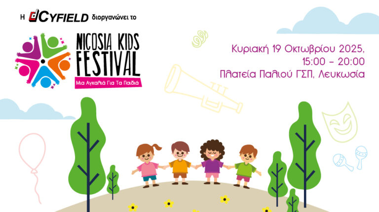 Η Cyfield διοργανώνει το Nicosia Kids Festival «Μια Αγκαλιά Για Τα Παιδιά» από τις 15:00 έως τις 20:00, στην Πλατεία του Παλιού ΓΣΠ, προσκαλώντας παιδιά και οικογένειες σε μια μεγάλη γιορτή.