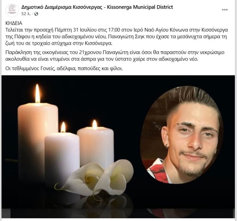 Θρήνο και βαρύ πένθος σκόρπισε στην κοινότητα Κισσόνεργας και σε ολόκληρη την επαρχία Πάφου ο αδόκητος θάνατος του 21χρονου Παναγιώτη Σιηκ. Τα όνειρα του άτυχου νεαρού «έσβησαν» στην άσφαλτο δέκα λεπτά μετά τα μεσάνυχτα όταν η τετράτροχη μοτοσικλέτα που οδηγούσε με κατεύθυνση προς τη λεωφόρο Χρίστου Κκέλη, προσέκρουσε σε σταθμευμένο όχημα στην οδό Γεωργίου Μιχαήλ.