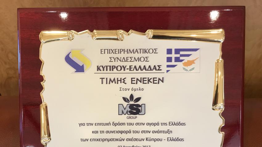 Μεγάλη τιμή αποτέλεσε για τον Όμιλο MSJ, η βράβευση για τη συνεισφορά του στην ανάπτυξη των επιχειρηματικών και οικονομικών σχέσεων Ελλάδας και Κύπρου η οποία πραγματοποιήθηκε στις 2 Δεκεμβρίου στα πλαίσια του Επίσημου Δείπνου του Επιχειρηματικού Συνδέσμου Κύπρου – Ελλάδας, που ανήκει στη δύναμη του ΚΕΒΕ.