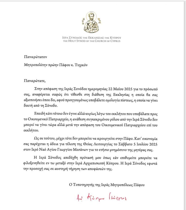 Την ίδια ώρα, ο Αρχιεπίσκοπος Κύπρου ανακοινώνει στον Επίσκοπο Τυχικό ότι δεν μπορεί να ασκεί λειτουργικά καθήκοντα στην Πάφο, με εξαίρεση την τέλεση Θείας Λειτουργίας για το μνημόσυνο της μητέρας του.