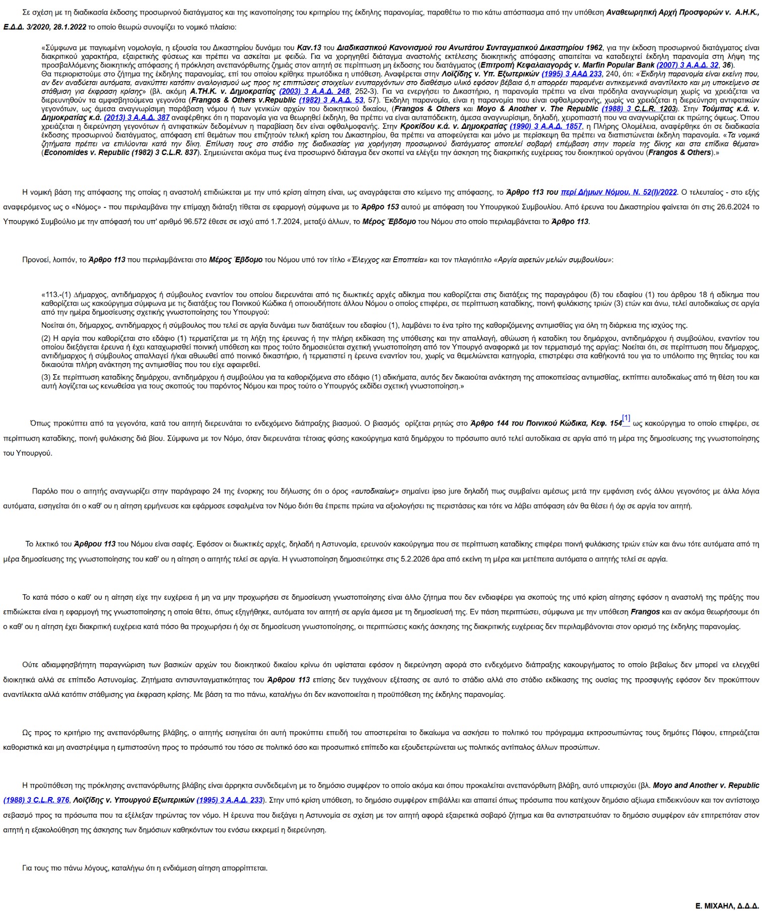 Με απόφαση του δικαστηρίου, η εν αργία Δήμαρχος αναγνώρισε με την εκλογή και την ανάληψη των καθηκόντων του τις διατάξεις του Περί Δήμων Νόμου που προνοούν ότι «εφόσον οι διωκτικές αρχές, δηλαδή η Αστυνομία, ερευνούν κακούργημα που σε περίπτωση καταδίκης επιφέρει ποινή φυλάκισης τριών ετών και άνω τότε αυτόματα από τη μέρα δημοσίευσης της γνωστοποίησης του καθ’ ου η αίτηση ο αιτητής τελεί σε αργία.»