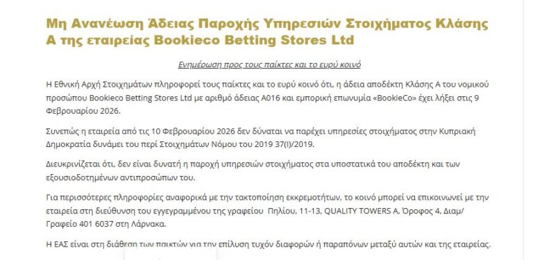 Σύμφωνα με ανακοίνωση, η εταιρεία από τις 10 Φεβρουαρίου 2026 δεν δύναται να παρέχει υπηρεσίες στοιχήματος στην Κυπριακή Δημοκρατία. H Aρχή διευκρινίζει ότι πλέον, δεν είναι δυνατή η παροχή υπηρεσιών στοιχήματος στα υποστατικά του αποδέκτη και των εξουσιοδοτημένων αντιπροσώπων του.