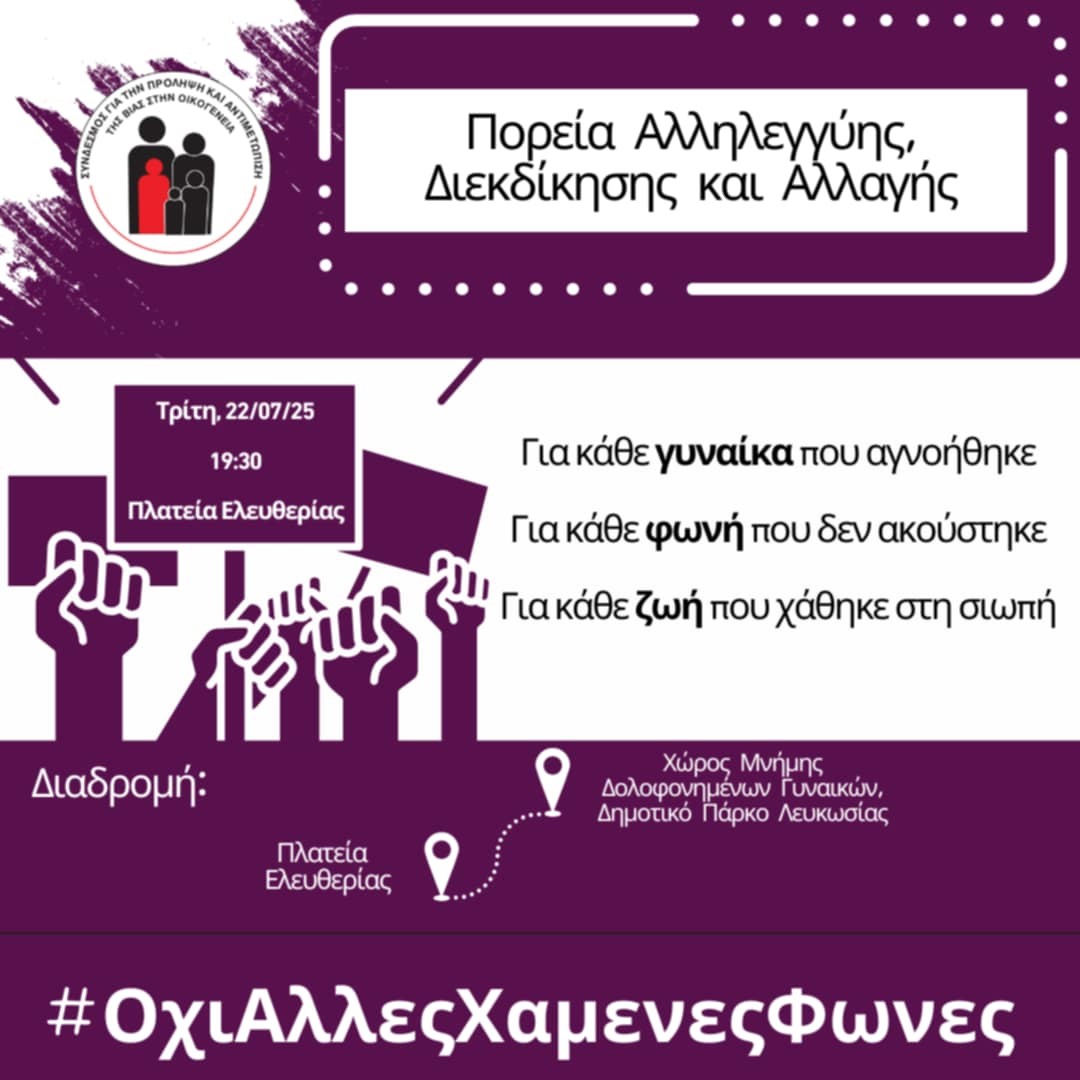 Η πορεία με σύνθημα «#ΌχιΆλλεςΧαμένεςΦωνές» πρόκειται να πραγματοποιηθεί την Τρίτη, 22 Ιουλίου, στις 19:30 και πρόκειται να αρχίσει από την Πλατεία Ελευθερίας στον Τόπο Μνήμης Δολοφονημένων Γυναικών προς το Δημοτικό Πάρκο Λευκωσίας.