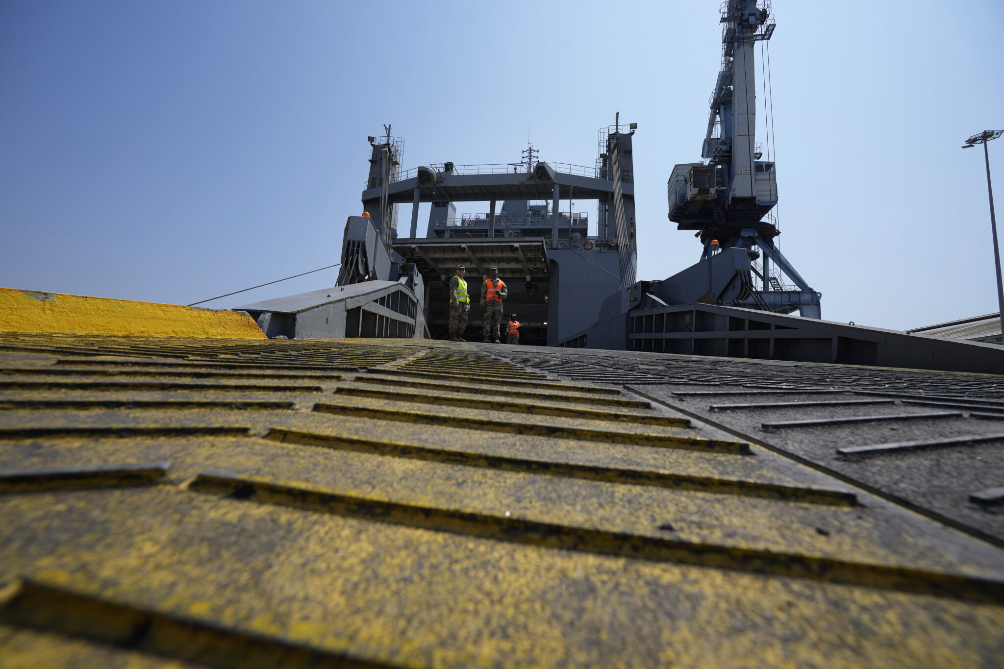 U.S soldiers stand on the docked U.S ship that will transport the Gaza aid, at the port in southern city of Larnaca, Cyprus, Wednesday, June 26, 2024. An official with the U.S. humanitarian assistance agency USAID says thousands of tons of food, medicines and other aid piled up on a Gaza beach isn’t reaching those in need because of a dire security situation on the ground where truck drivers are either getting caught in the crossfire or have their cargo seized by “gang-like” groups. (AP Photo/Petros Karadjias)