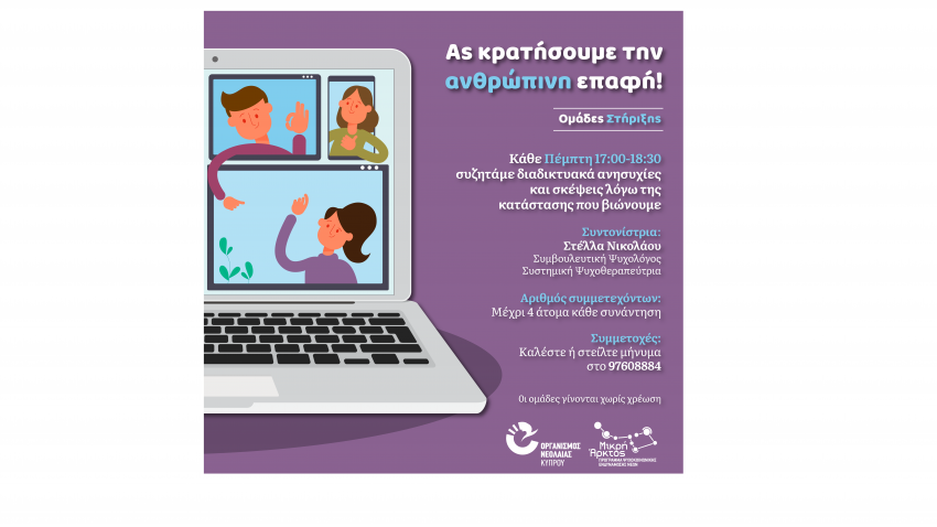Το πρόγραμμα Ψυχοκοινωνικής Ενδυνάμωσης «Μικρή Άρκτος» του Οργανισμού Νεολαίας Κύπρου, διοργανώνει Ομάδες Τηλεδιάσκεψης μέσω του προγράμματος Skype όπου κάθε Πέμπτη, από τις 2 Απριλίου, θα έχουμε την ευκαιρία να ανταλλάζουμε σκέψεις και συναισθήματα που προκύπτουν από την παρούσα κατάσταση καθώς και να συζητήσουμε τρόπους και ιδέες διαχείρισής τους.
