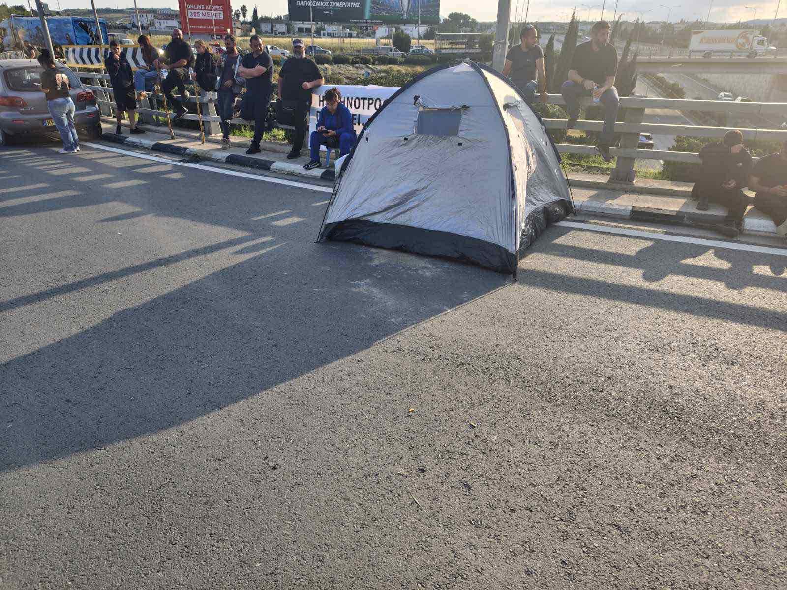 Κτηνοτρόφοι έστησαν φουκούδες και καρέκλες, δίπλα από τα κιγκλιδώματα του κυκλικού κόμβου, ο οποίος παραμένει αποκλεισμένος για τη διέλευση οχημάτων.