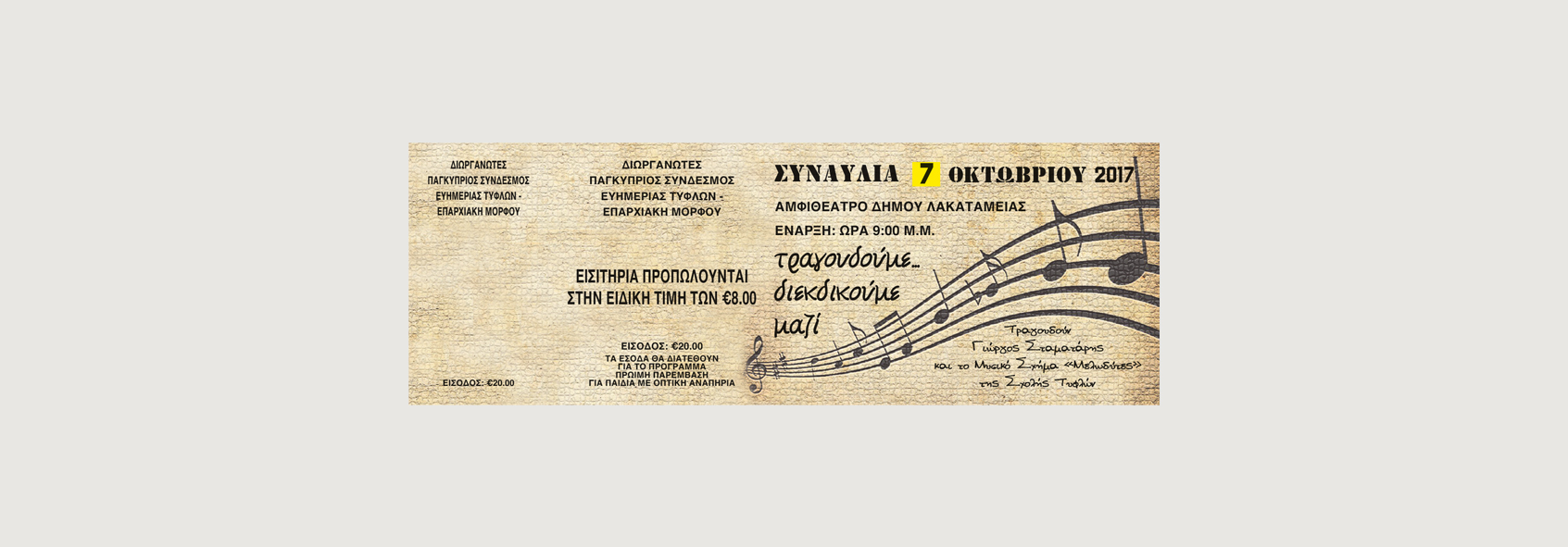 Για την επίτευξη του στόχου, διοργανώνεται στις 7 Οκτωβρίου 2017, συναυλία με τον Κύπριο καλλιτέχνη Γεώργιο Σταματάρη και το Μουσικό σχήμα «Μελωδίτες» της Σχολής Τυφλών, στο Αμφιθέατρο Δήμου Λακατάμιας, στις 21:00. Εισιτήρια προπωλούνται στην ειδική τιμή των €8.00 στα πιο κάτω σημεία: