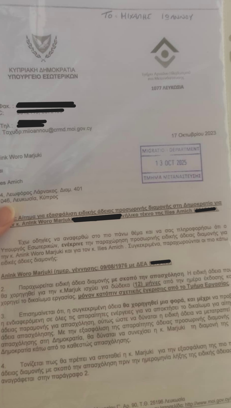 Με σφραγίδα 13/10/25 όταν ο Ηλίας κατέθεσε για πολλοστή φορά τα χαρτιά του στο Υφ. Μετανάστευσης