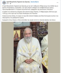 Η κηδεία του εκλιπόντος κληρικού, θα τελεστεί αύριο Πέμπτη, 12 Φεβρουαρίου 2026 και ώρα 15:30 μ.μ. στον ιερό ναό του Αγίου Θεοδώρου στο Πολιτικό.