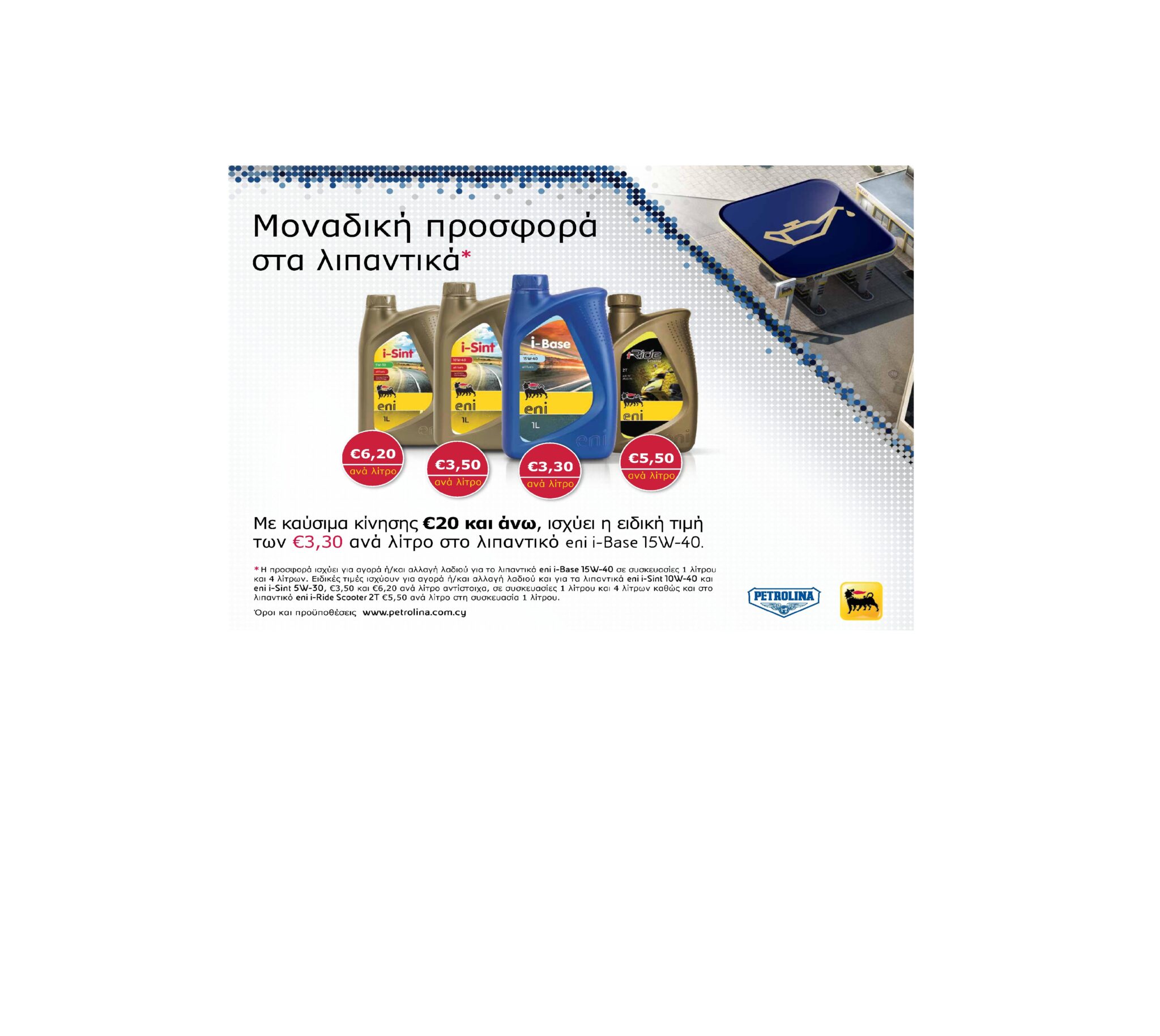 Ειδικές τιμές για αγορά ή/και αλλαγή λαδιού στα τέσσερα ακόλουθα λιπαντικά και στις συσκευασίες 1 λίτρου ή/και 4 λίτρων: α) eni i–Base 15W-40 / €3,30 ανά λίτρο, β) eni i–Sint 10W-40 / €3,50 ανά λίτρο, γ) eni i–Sint 5W-30 / €6,20 ανά λίτρο και δ) eni i–Ride Scooter 2T / €5,50 ανά λίτρο.