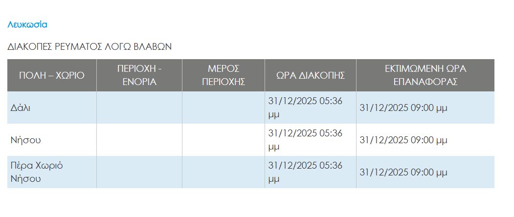 Οι επηρεαζόμενες περιοχές είναι το Δάλι, η Νήσου και το Πέρα Χωριό Νήσου, με την εκτιμώμενη ώρα επαναφοράς της ηλεκτροδότησης να είναι γύρω στις 9:00μμ.