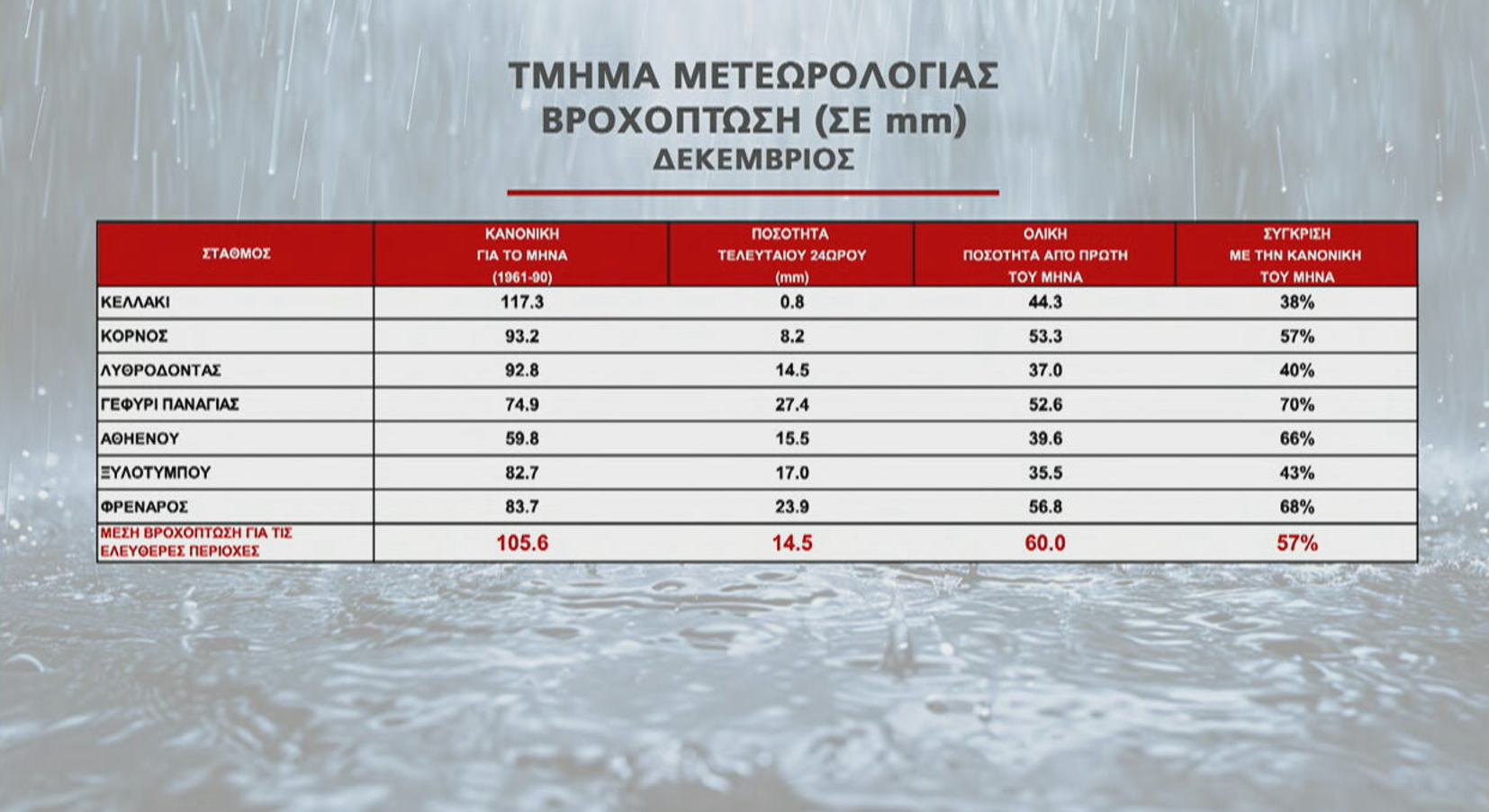 Όπως ανέφερε ο Εκπρόσωπος Τύπου της Μετεωρολογικής, Ανδρέας Χρυσάνθου, στην εκπομπή Alpha Ενημέρωση, μέχρι και το πρωί της Τετάρτης, η βροχόπτωση έχει φτάσει στο 57% της κανονικής για τον μήνα Δεκέμβριο, και στο 50% για το υδρολογικό έτος.