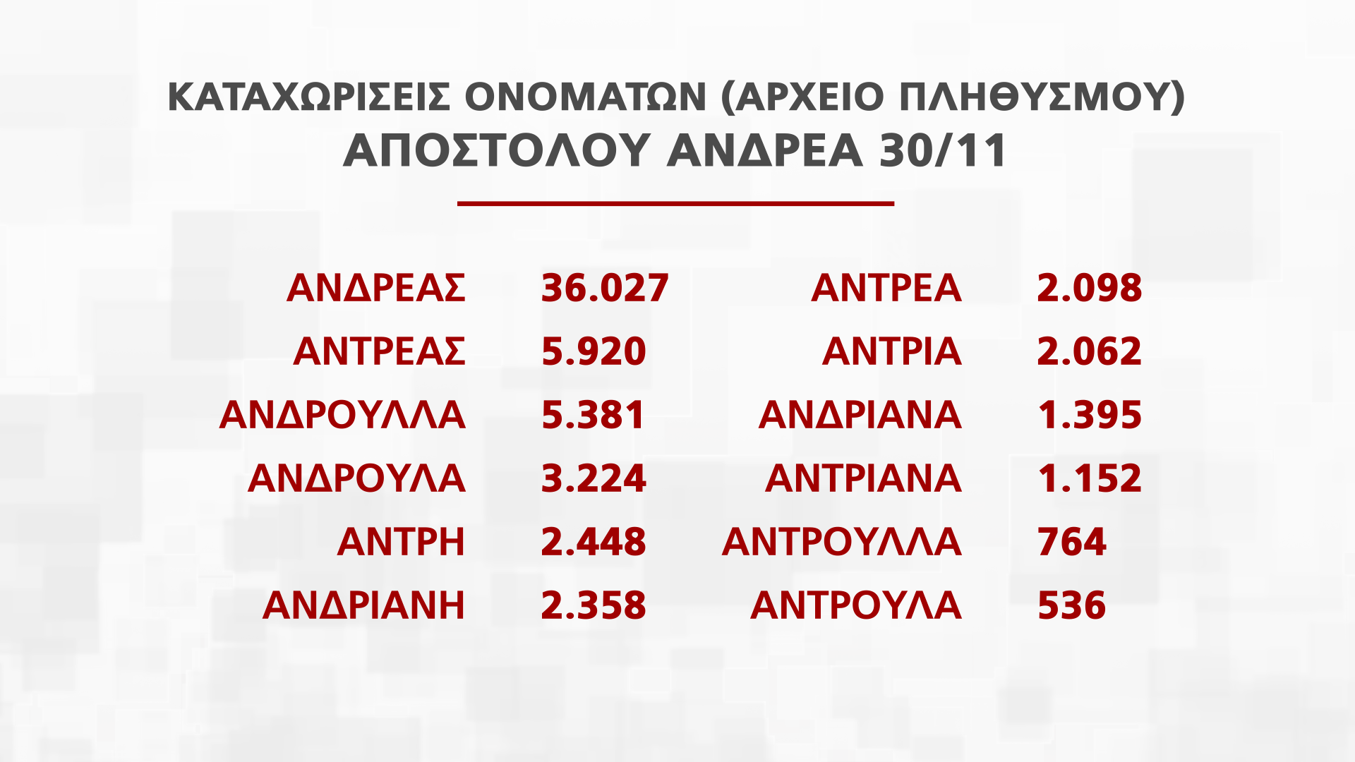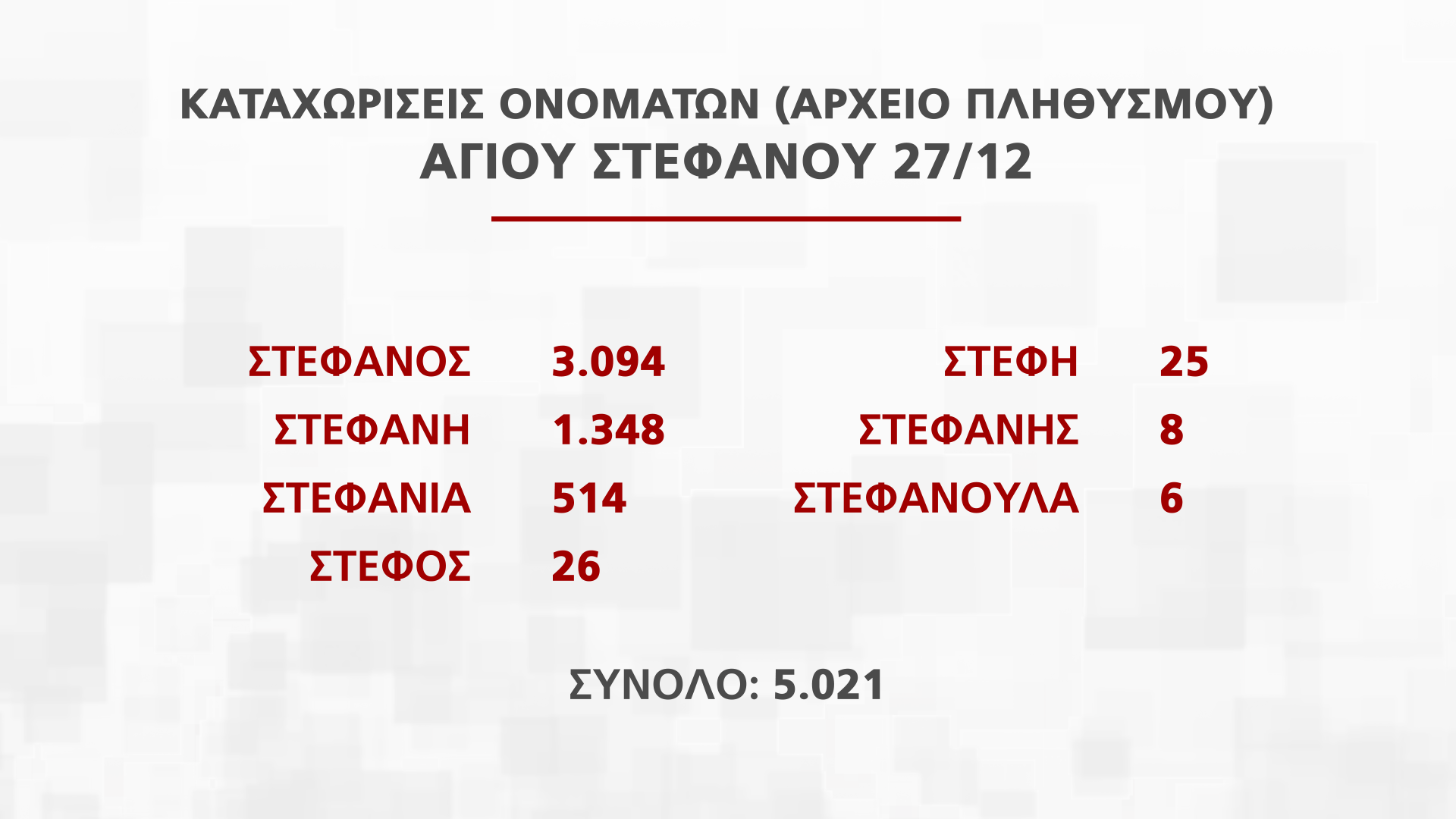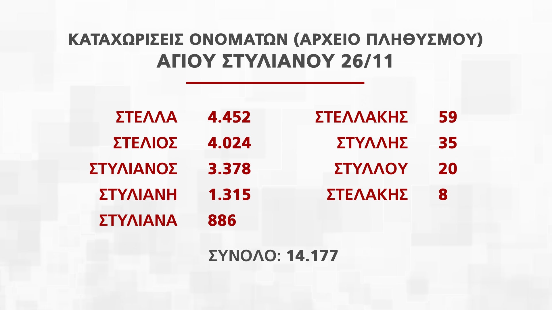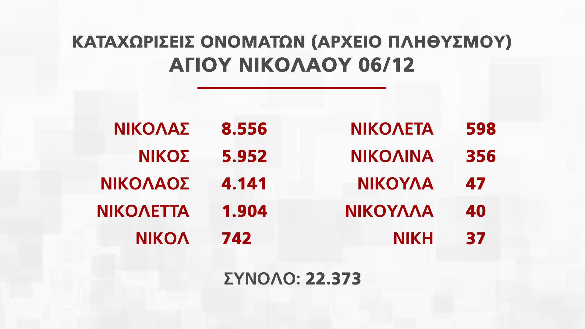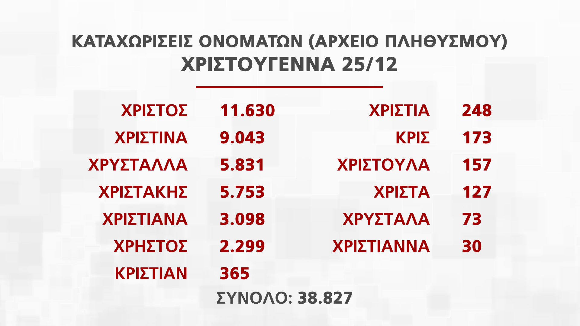 Η Διευθύντρια Διεύθυνσης Αρχείου Πληθυσμού και Εκλογών Νατάσα Οικονόμου παρουσίασε στην εκπομπή Alpha Ενημέρωση στοιχεία για τα ονόματα που εορτάζουν από τις 25 Νοεμβρίου μέχρι την Πρωτοχρονιά, που αντιστοιχούν σε πέραν των 250 χιλιάδων πολιτών.
