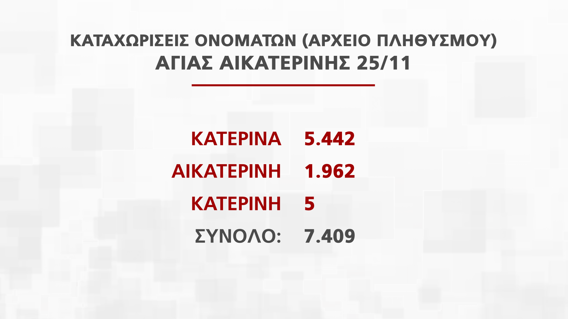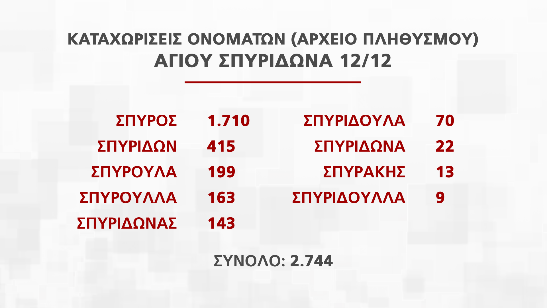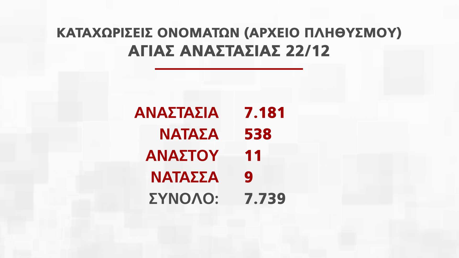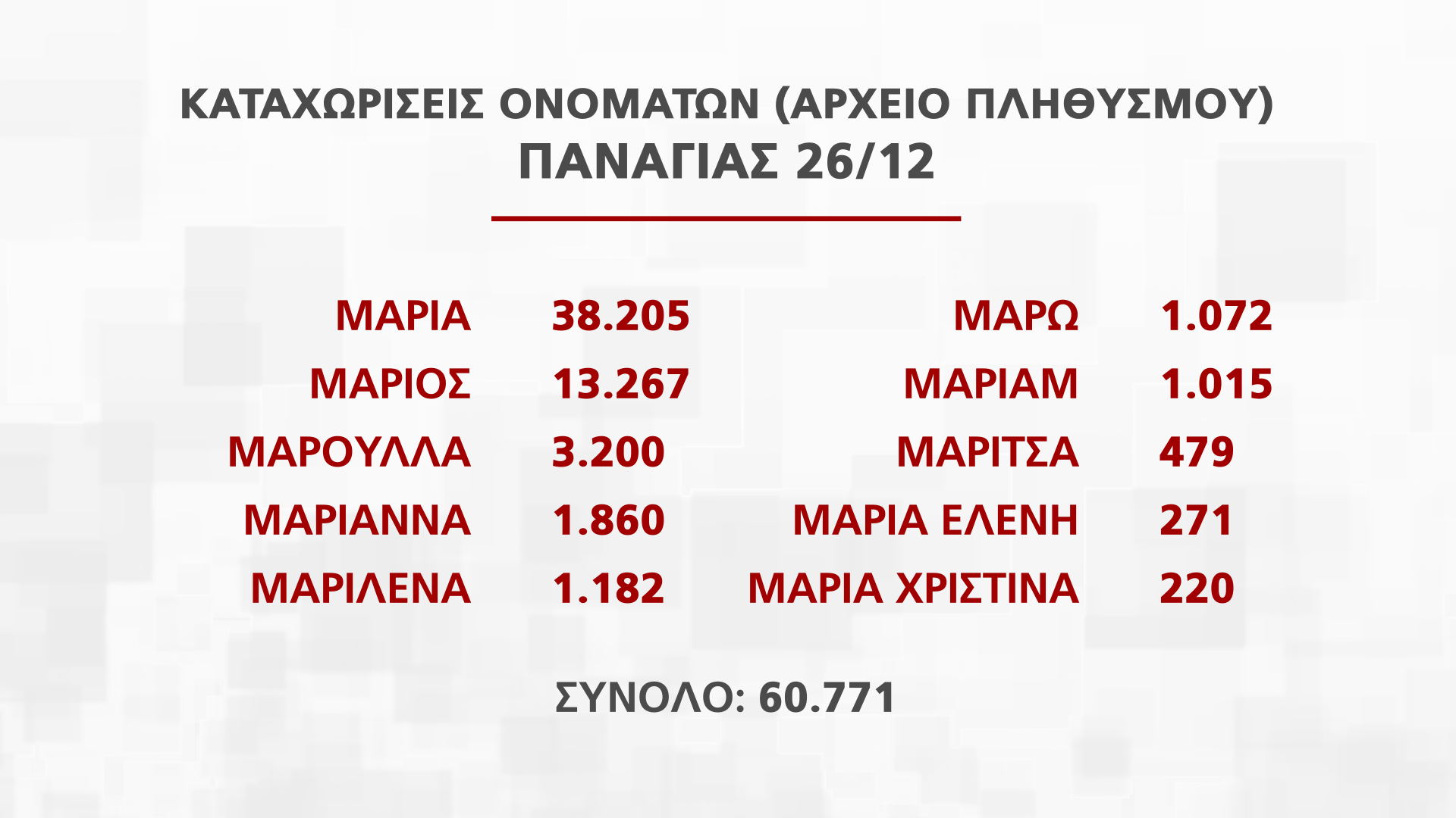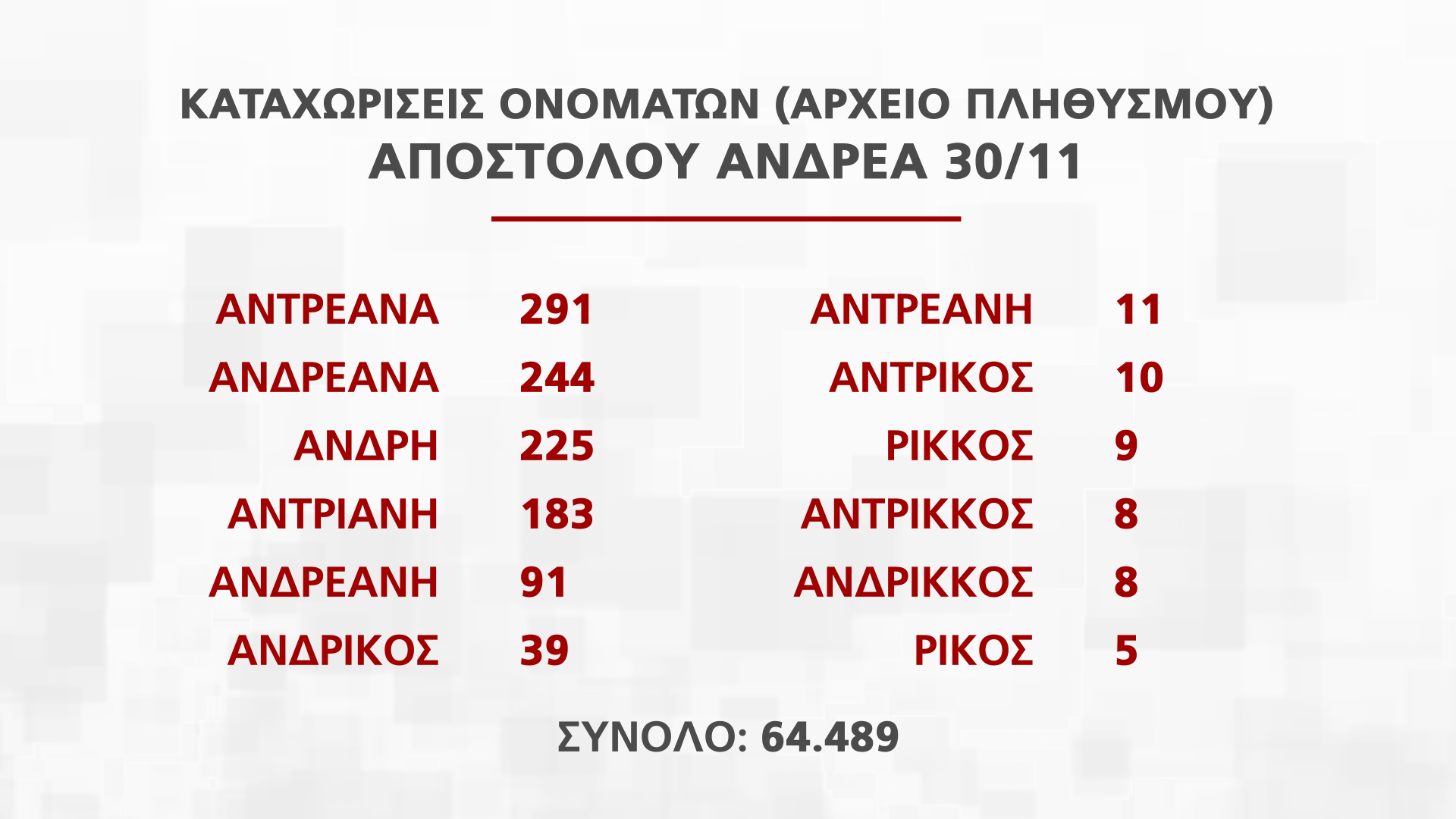 Η Διευθύντρια Διεύθυνσης Αρχείου Πληθυσμού και Εκλογών Νατάσα Οικονόμου παρουσίασε στην εκπομπή Alpha Ενημέρωση στοιχεία για τα ονόματα που εορτάζουν από τις 25 Νοεμβρίου μέχρι την Πρωτοχρονιά, που αντιστοιχούν σε πέραν των 250 χιλιάδων πολιτών.