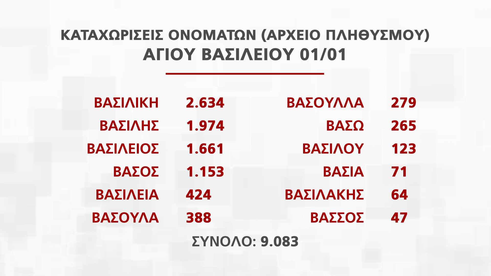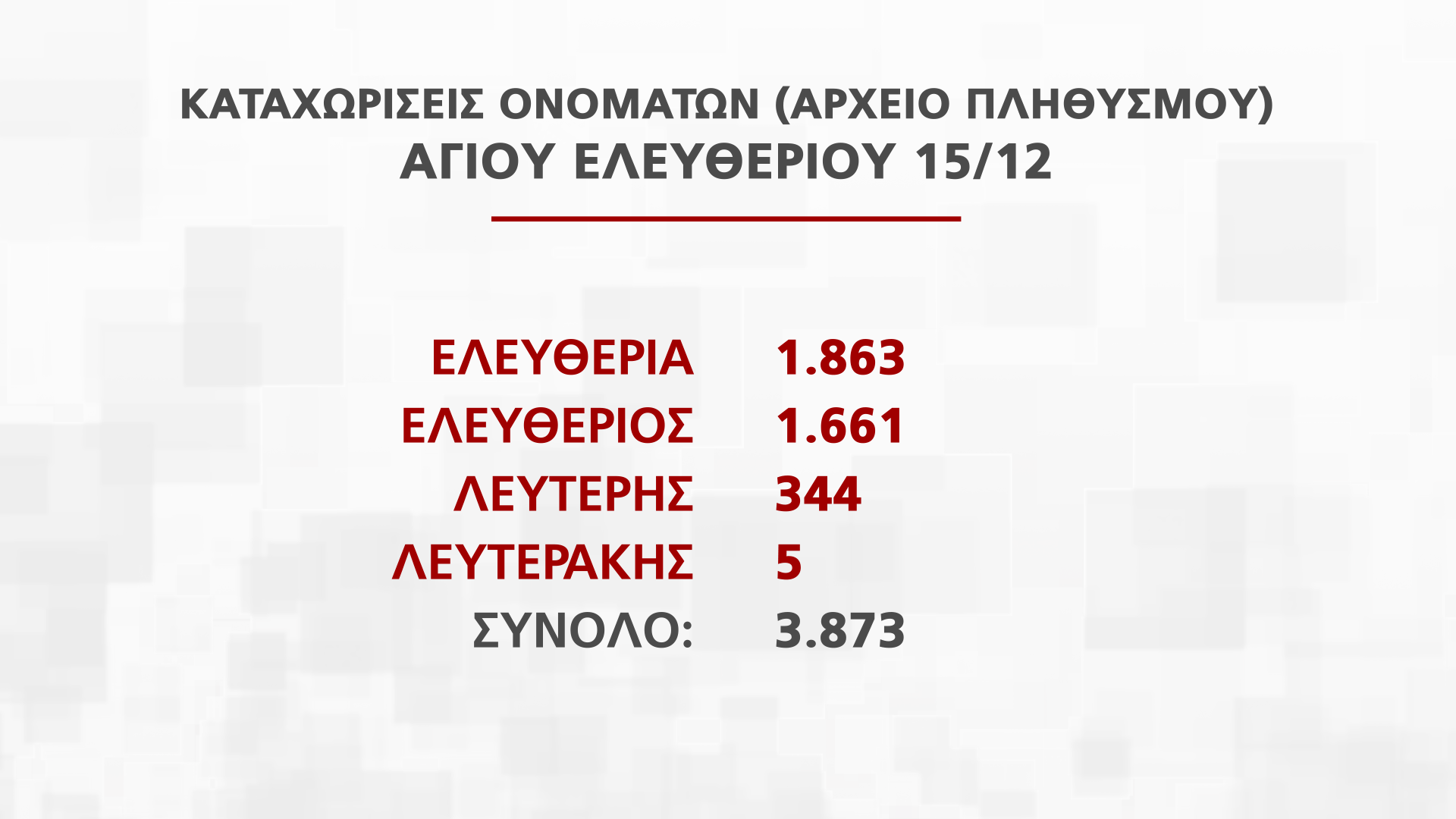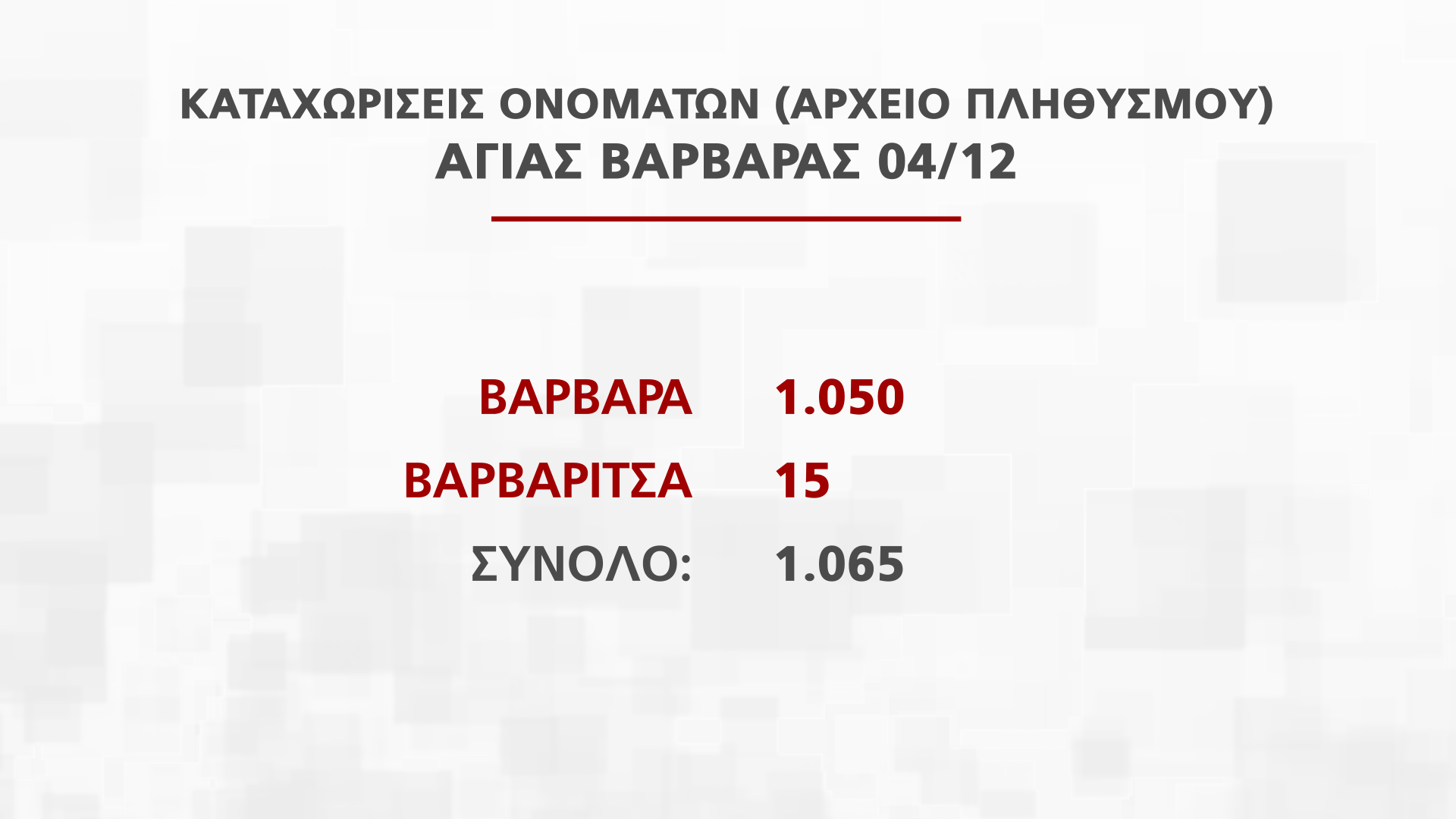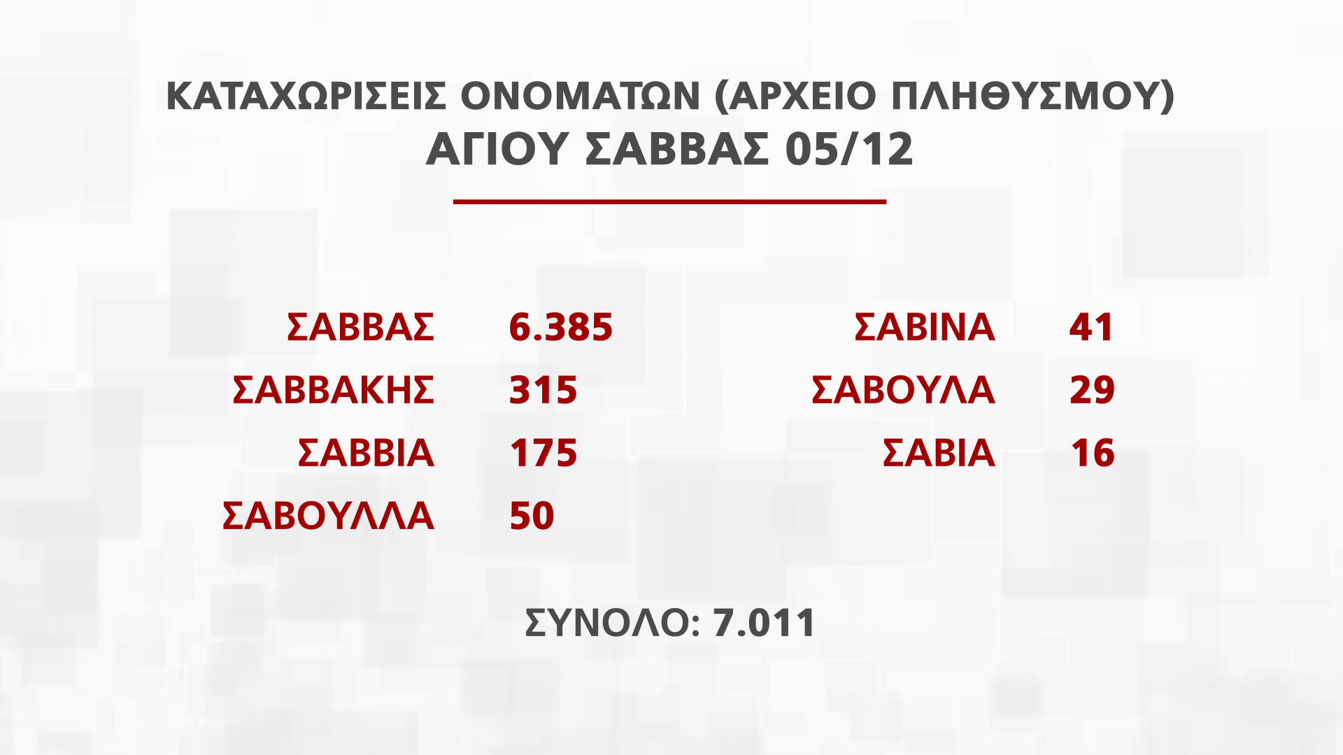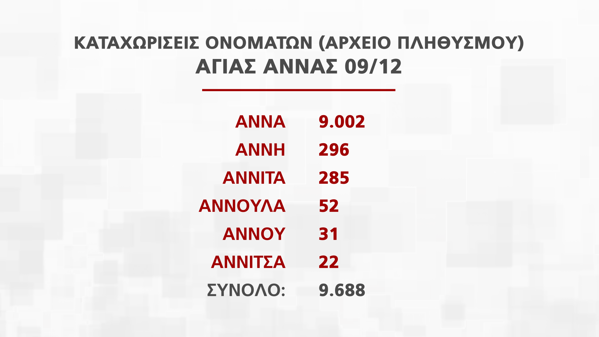Η Διευθύντρια Διεύθυνσης Αρχείου Πληθυσμού και Εκλογών Νατάσα Οικονόμου παρουσίασε στην εκπομπή Alpha Ενημέρωση στοιχεία για τα ονόματα που εορτάζουν από τις 25 Νοεμβρίου μέχρι την Πρωτοχρονιά, που αντιστοιχούν σε πέραν των 250 χιλιάδων πολιτών.