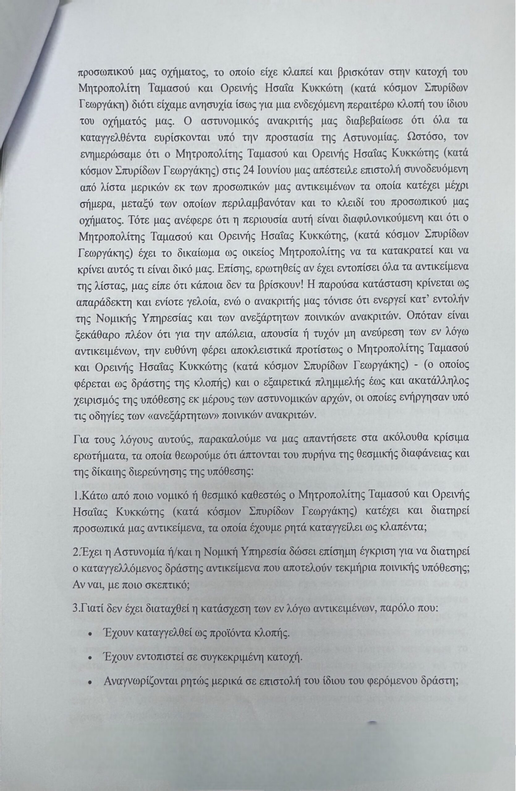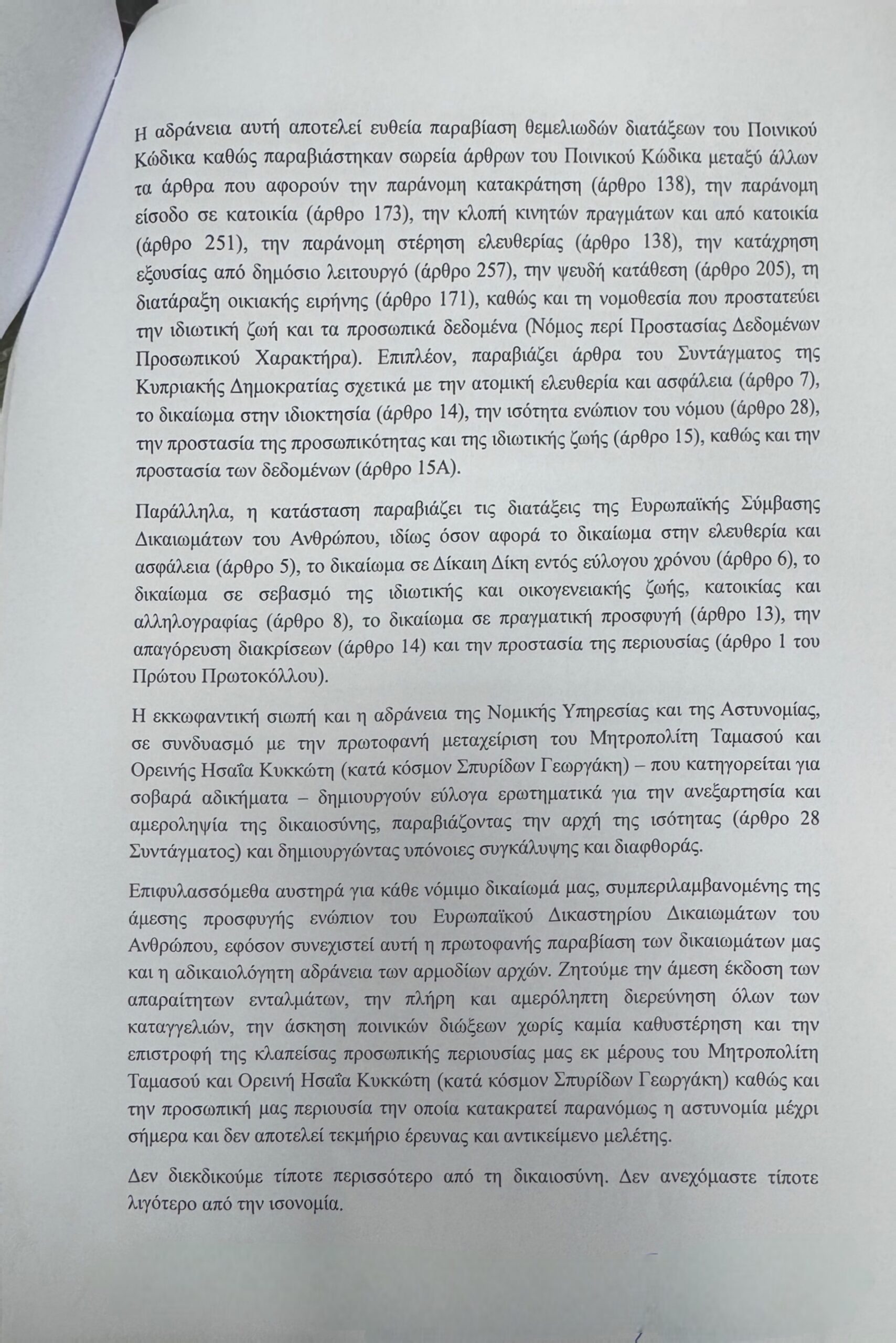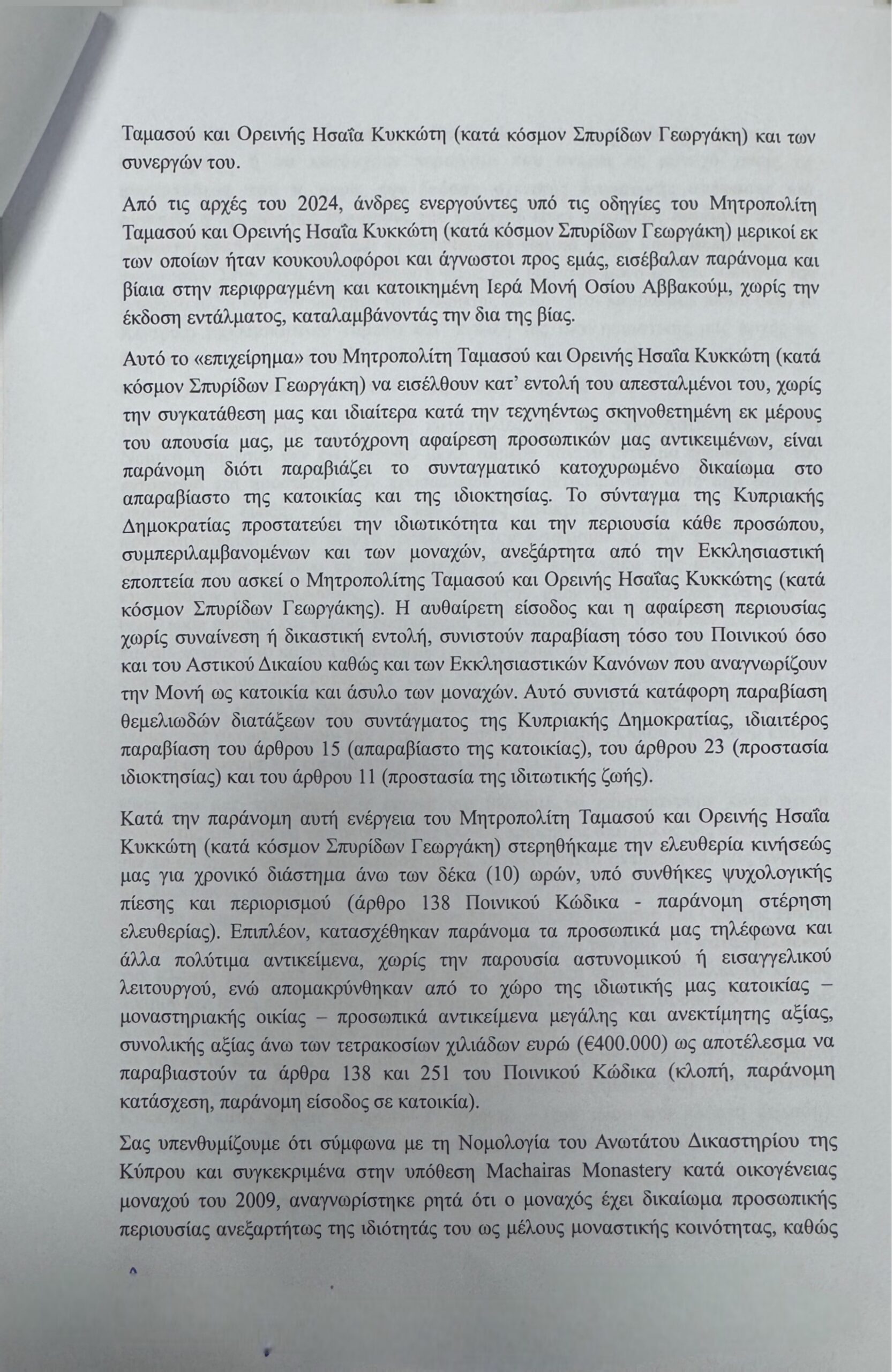 Επίσης, καταγγέλλουμε με έντονο τρόπο την αστυνομία για την αδυναμία και την αδιαφορία που επέδειξε στην προστασία της προσωπικής μας περιουσίας εντός του μοναστηριού, παρά τις επανειλημμένες καταγγελίες μας ως πολίτες αυτής της «Δημοκρατίας». Η αστυνομία όπως γνωρίζουμε οφείλει να διασφαλίζει την εφαρμογή του νόμου και την προστασία των δικαιωμάτων μας σύμφωνα με το Σύνταγμα και τη σχετική νομοθεσία, όμως δεν έλαβε τα απαραίτητα μέτρα για να αποτρέψει την αυθαίρετη και παράνομη συμπεριφορά του Μητροπολίτη Ταμασού και Ορεινής Ησαΐα Κυκκώτη (κατά κόσμον Σπυρίδων Γεωργάκη) ο οποίος, με τις καταγγελλόμενες εγκληματικές του ενέργειες, έχει καταστήσει τον εαυτό του όχι μόνο επικίνδυνο για τη δημόσια τάξη, αλλά και επιβλαβή για το ίδιο το δημόσιο συμφέρον. Η ιδιότητά του ως Εκκλησιαστικού αξιωματούχου δεν μπορεί να αποτελεί άλλοθι για ασυλία ούτε κάλυμμα για παράνομες πρακτικές· αντιθέτως, η ανοχή απέναντί του τροφοδοτεί την ατιμωρησία και πλήττει κατάφορα το Κράτος Δικαίου. Η αδράνεια αυτή δημιουργεί επικίνδυνο προηγούμενο για την παραβίαση του νόμου και της δικαιοσύνης εντός εκκλησιαστικών χώρων και μας αναγκάζει να ζητήσουμε «άμεση» παρέμβαση και ουσιαστικά μέτρα προστασίας εκ μέρους των Αρμόδιων Αρχών.