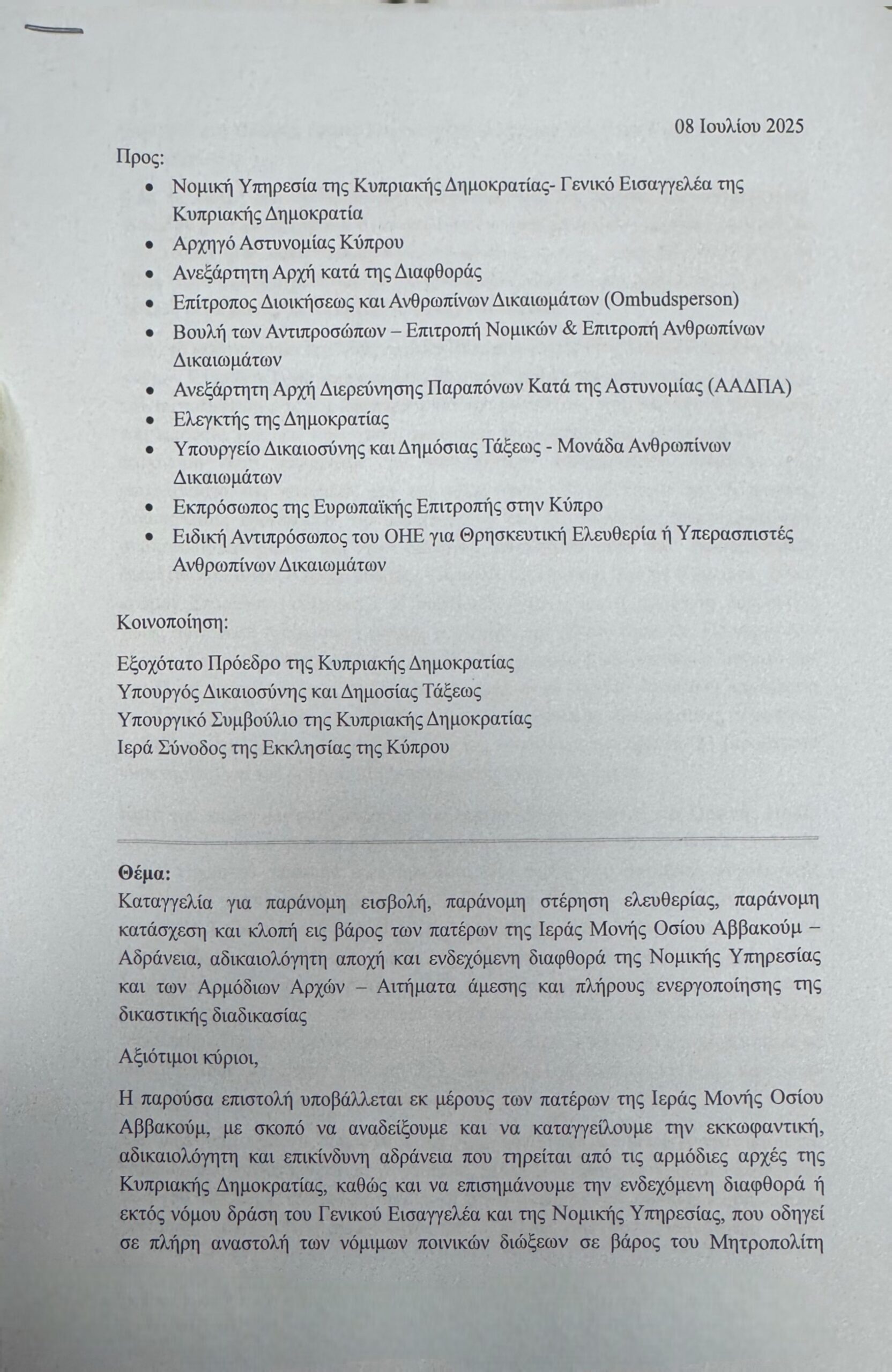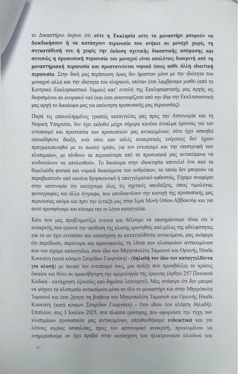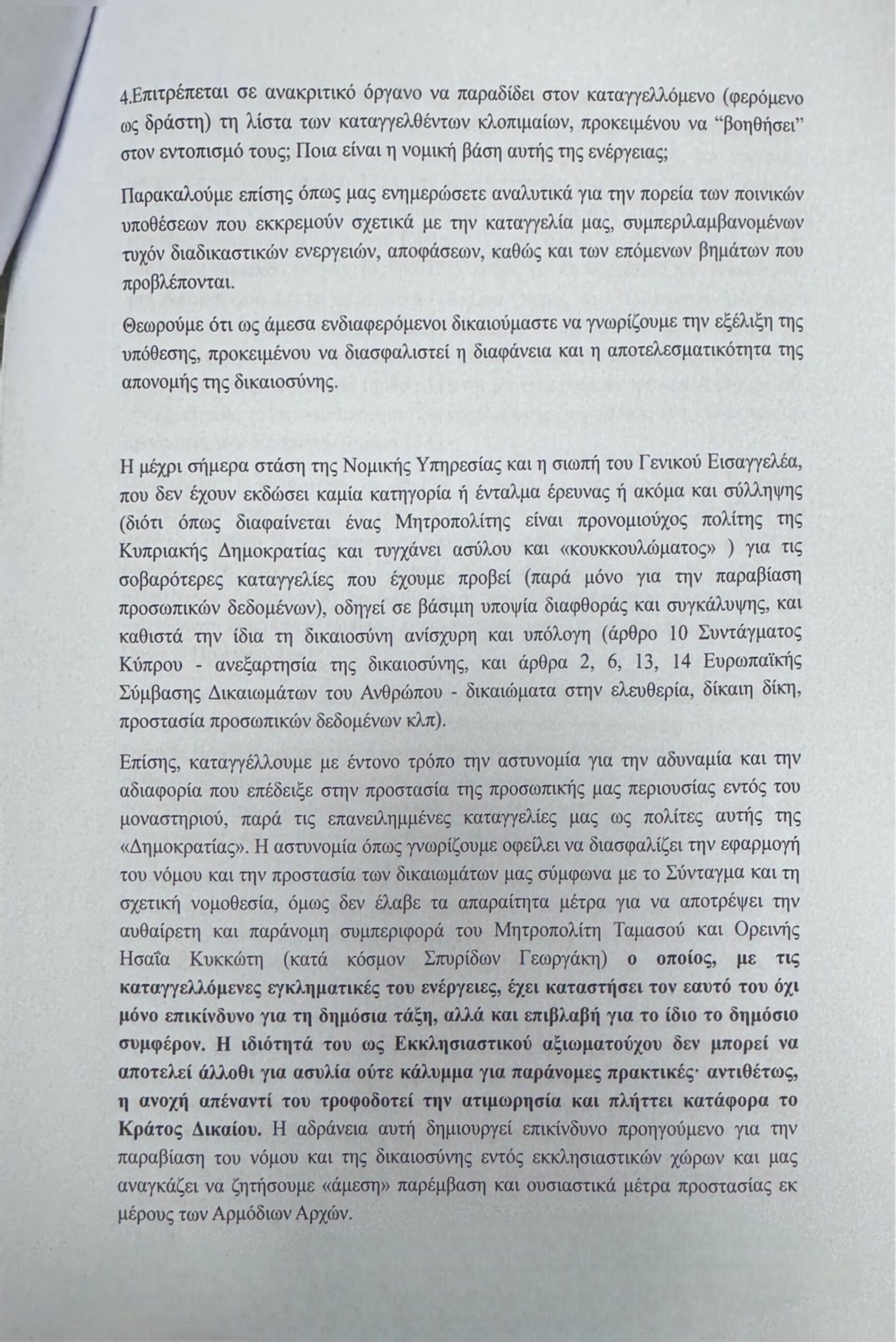 Επίσης, καταγγέλλουμε με έντονο τρόπο την αστυνομία για την αδυναμία και την αδιαφορία που επέδειξε στην προστασία της προσωπικής μας περιουσίας εντός του μοναστηριού, παρά τις επανειλημμένες καταγγελίες μας ως πολίτες αυτής της «Δημοκρατίας». Η αστυνομία όπως γνωρίζουμε οφείλει να διασφαλίζει την εφαρμογή του νόμου και την προστασία των δικαιωμάτων μας σύμφωνα με το Σύνταγμα και τη σχετική νομοθεσία, όμως δεν έλαβε τα απαραίτητα μέτρα για να αποτρέψει την αυθαίρετη και παράνομη συμπεριφορά του Μητροπολίτη Ταμασού και Ορεινής Ησαΐα Κυκκώτη (κατά κόσμον Σπυρίδων Γεωργάκη) ο οποίος, με τις καταγγελλόμενες εγκληματικές του ενέργειες, έχει καταστήσει τον εαυτό του όχι μόνο επικίνδυνο για τη δημόσια τάξη, αλλά και επιβλαβή για το ίδιο το δημόσιο συμφέρον. Η ιδιότητά του ως Εκκλησιαστικού αξιωματούχου δεν μπορεί να αποτελεί άλλοθι για ασυλία ούτε κάλυμμα για παράνομες πρακτικές· αντιθέτως, η ανοχή απέναντί του τροφοδοτεί την ατιμωρησία και πλήττει κατάφορα το Κράτος Δικαίου. Η αδράνεια αυτή δημιουργεί επικίνδυνο προηγούμενο για την παραβίαση του νόμου και της δικαιοσύνης εντός εκκλησιαστικών χώρων και μας αναγκάζει να ζητήσουμε «άμεση» παρέμβαση και ουσιαστικά μέτρα προστασίας εκ μέρους των Αρμόδιων Αρχών.