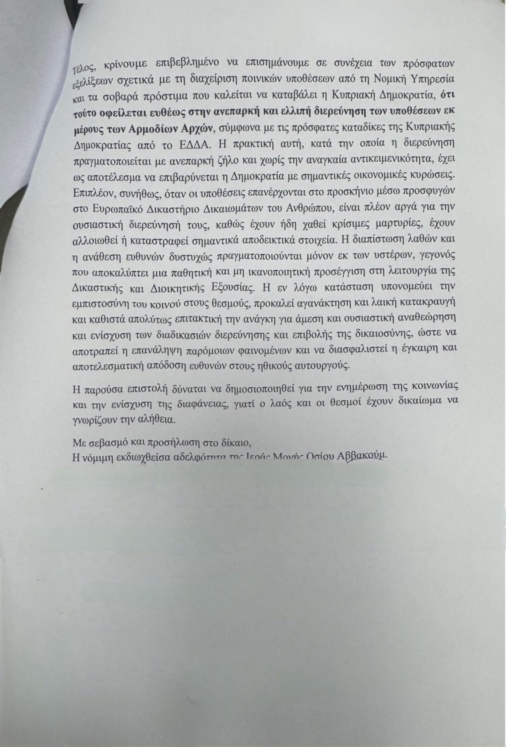Η παρούσα επιστολή υποβάλλεται εκ μέρους των πατέρων της Ιεράς Μονής Οσίου Αββακούμ, με σκοπό να αναδείξουμε και να καταγγείλουμε την εκκωφαντική, αδικαιολόγητη και επικίνδυνη αδράνεια που τηρείται από τις αρμόδιες αρχές της Κυπριακής Δημοκρατίας, καθώς και να επισημάνουμε την ενδεχόμενη διαφθορά ή εκτός νόμου δράση του Γενικού Εισαγγελέα και της Νομικής Υπηρεσίας, που οδηγεί σε πλήρη αναστολή των νόμιμων ποινικών διώξεων σε βάρος του Μητροπολίτη Ταμασού και Ορεινής Ησαΐα Κυκκώτη (κατά κόσμον Σπυρίδων Γεωργάκη) και των συνεργών του.