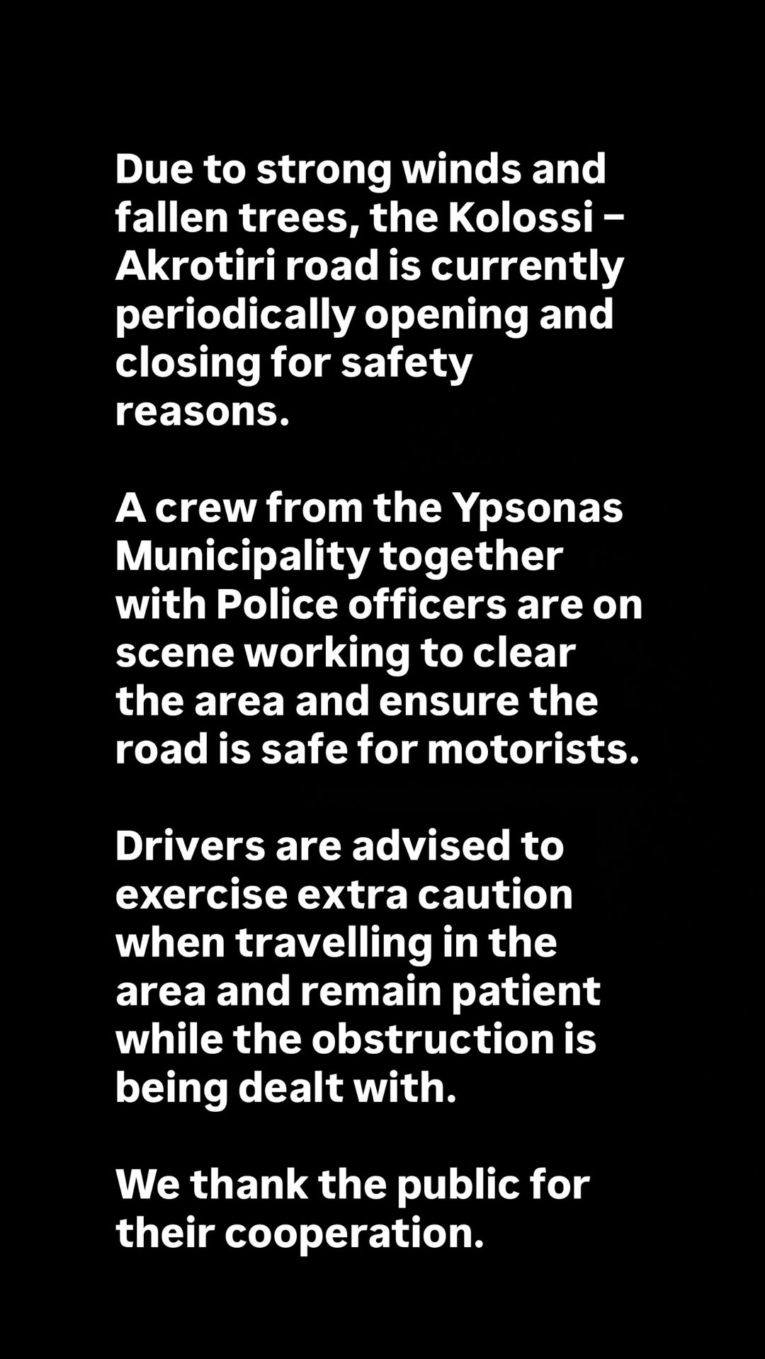 Παράλληλα η αστυνομία των Βρετανικών Βάσεων ενημερώνει πως ο δρόμος Κολοσσίου – Ακρωτηρίου είναι περιοδικά κλειστός για λόγους ασφαλείας λόγω των ανέμων και πτώσεων δέντρων.